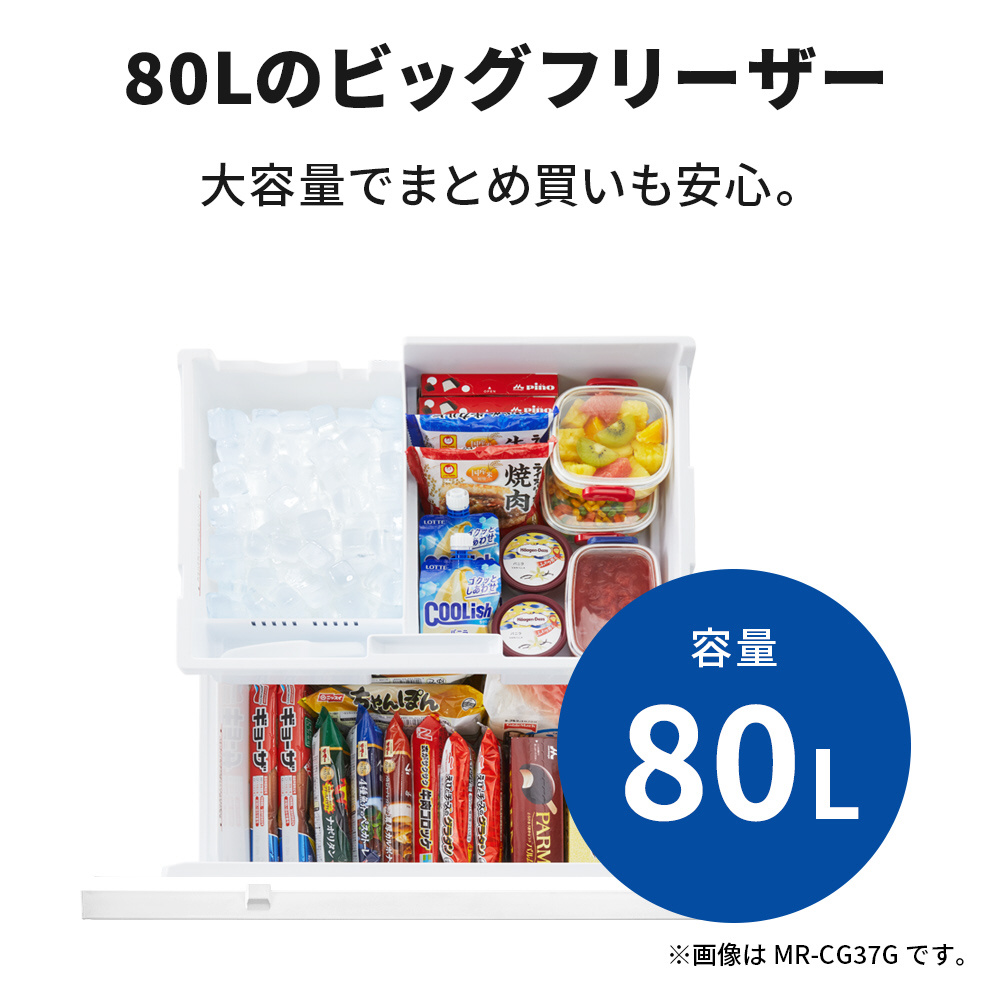 ・同容量帯でトップクラスの大容量80Lフリーザーで、まとめ買いにも対応。