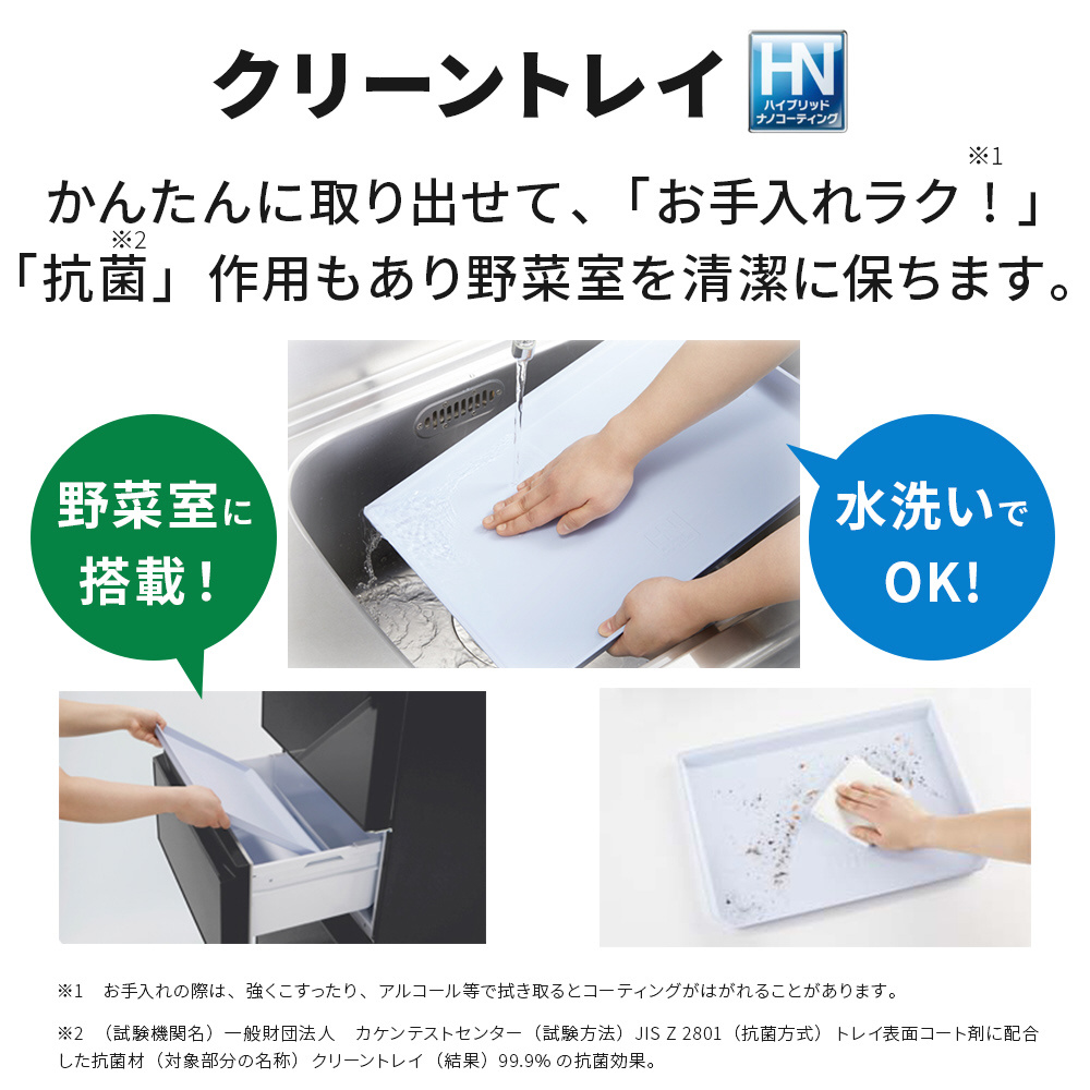 ・当社独自のコーティングにより汚れの付着を抑え、さらに抗菌効果のあるトレイを野菜室の底面に採用。