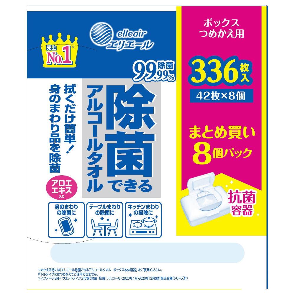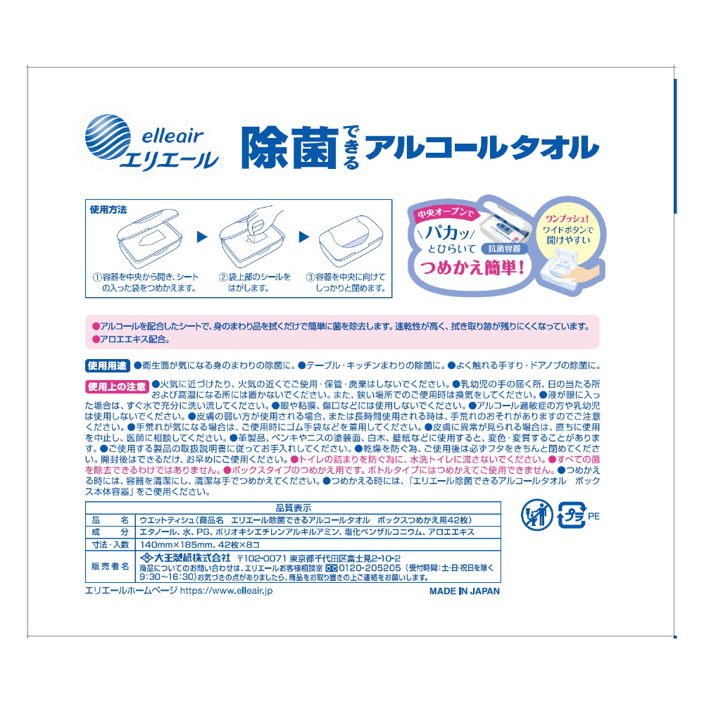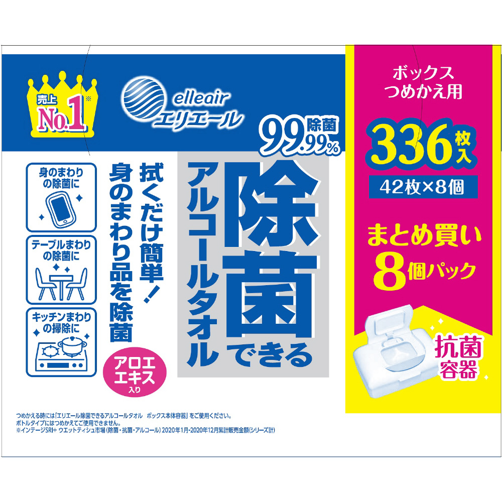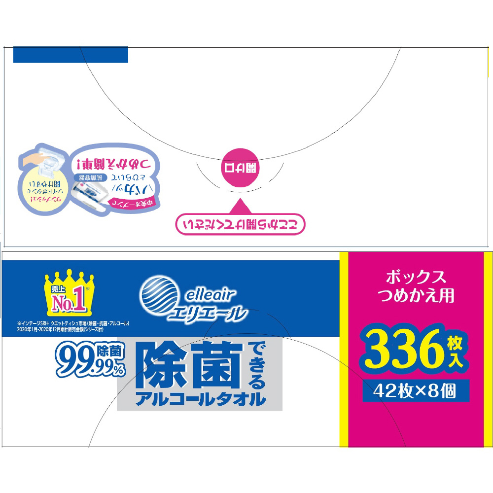 | 商品名 | elleair(エリエール)除菌できるアルコールタオル ボックス つめかえ用 42枚×8個(336枚) |