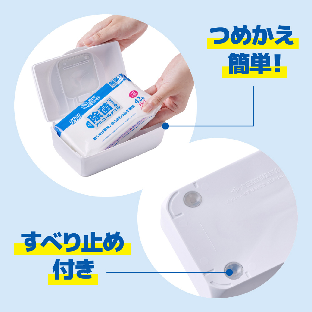 片手で使いやすいボックスタイプのつめかえ用です。アルコールを配合したシートで、身のまわり品を拭くだけで簡単に菌を除去します。