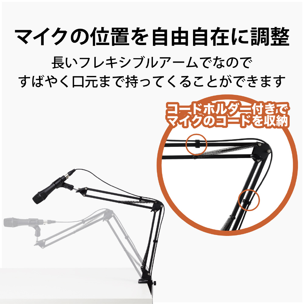 ■アームにはコードホルダーが付いているため、マイクのコードを収納して机まわりをすっきりさせることができます。
