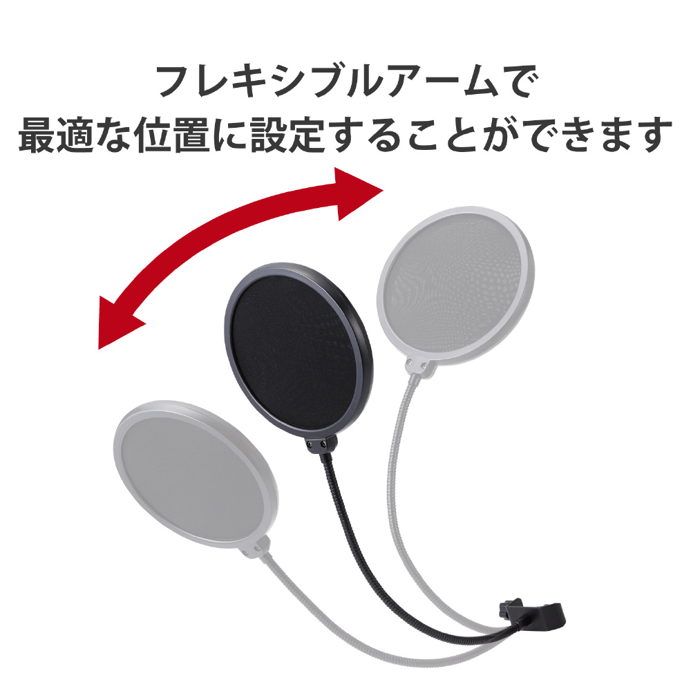 | 仕様1 | ■材質:本体:PP、鉄、EVA糊緩衝材、ポリエステル ■外形寸法:直径約153mm(フィルター外径)、長さ約360mm(アーム) ■重量:約200g ■カラー:ブラック ■対応機種:直径約25mmまでのマイクスタンドの支柱 ■角度調節:○ |