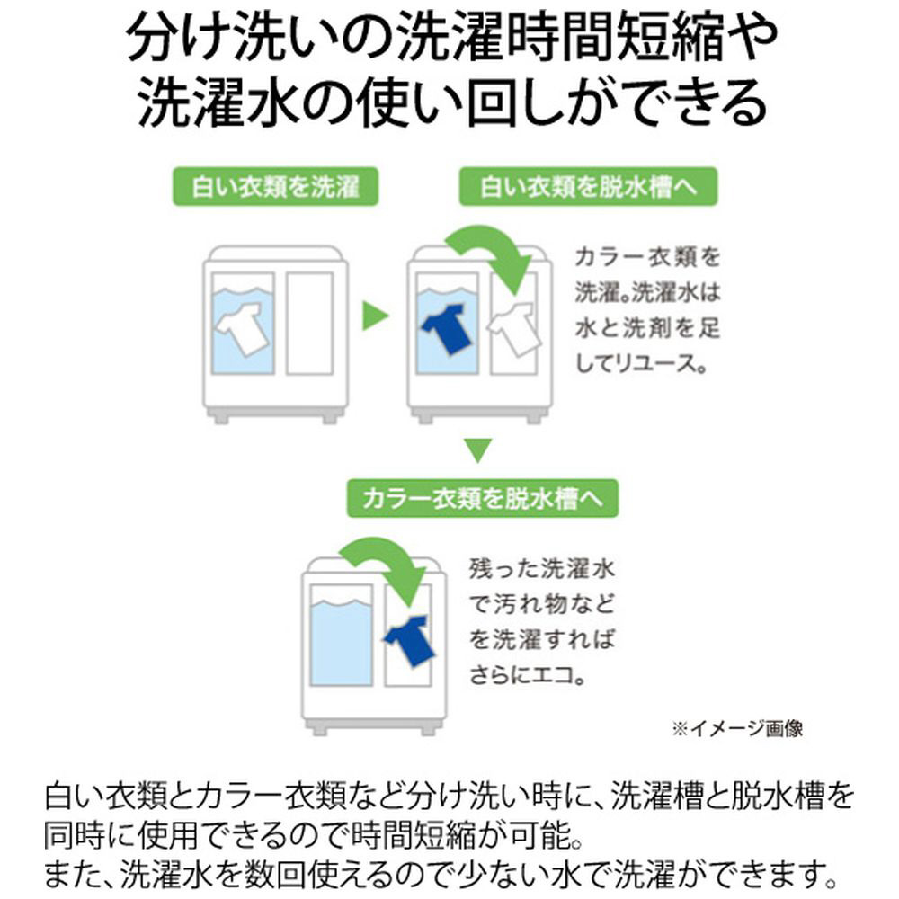 白い衣類とカラー衣類など分け洗い時に、洗濯槽と脱水槽を同時に使用できるので時間短縮が可能。また、洗濯水を数回使えるので少ない水で洗濯ができます。