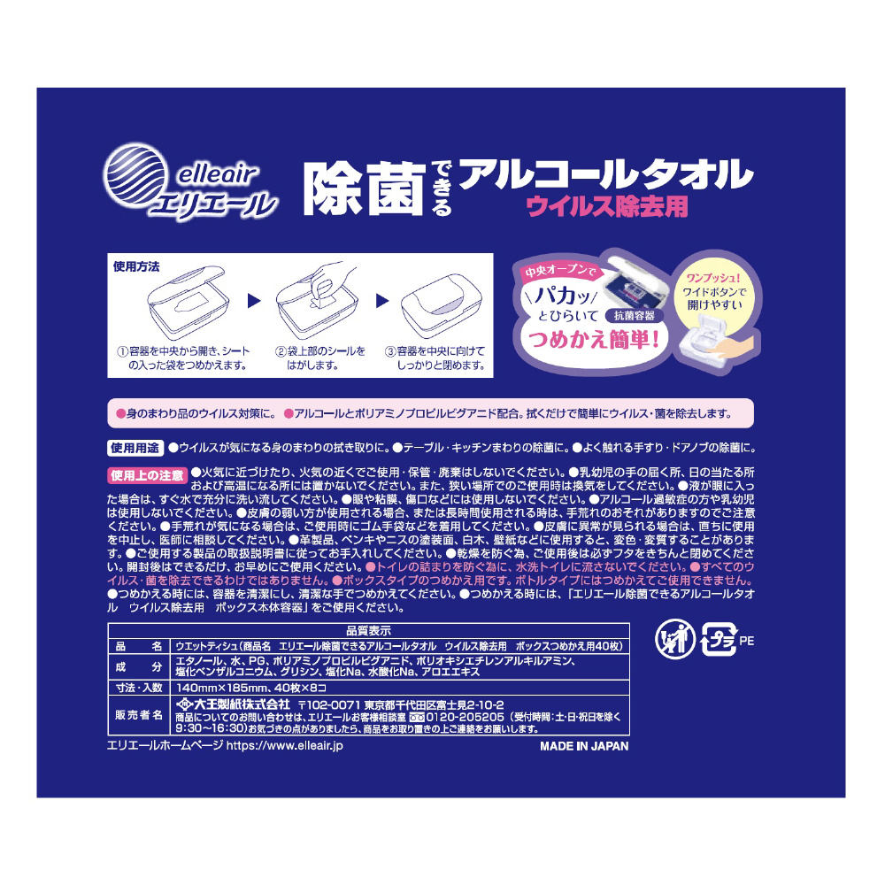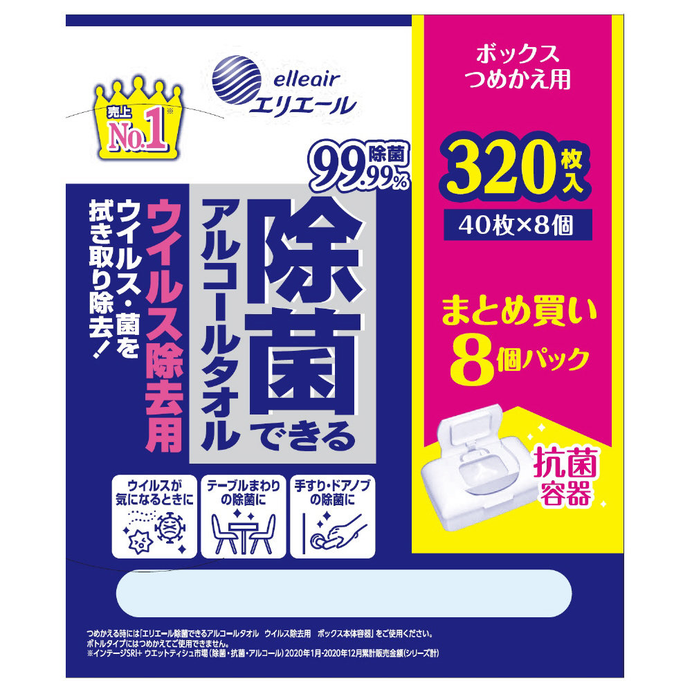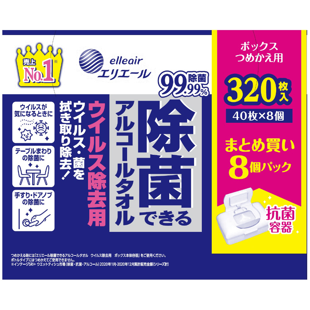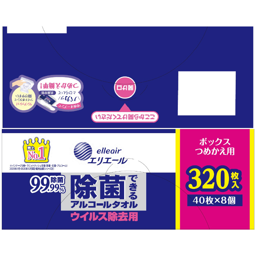 | 商品名 | elleair(エリエール)除菌できるアルコールタオル ウイルス除去用 ボックス つめかえ用 40枚×8個(320枚) |