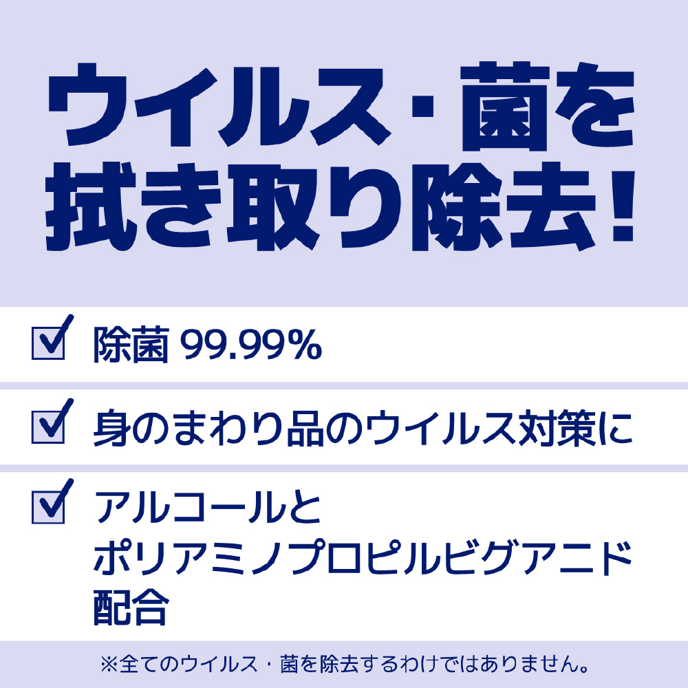 アルコールとポリアミノプロピルビグアニド配合しており、拭くだけで簡単にウイルス・菌を除去します。身のまわり品のウイルス対策としてお使いください。