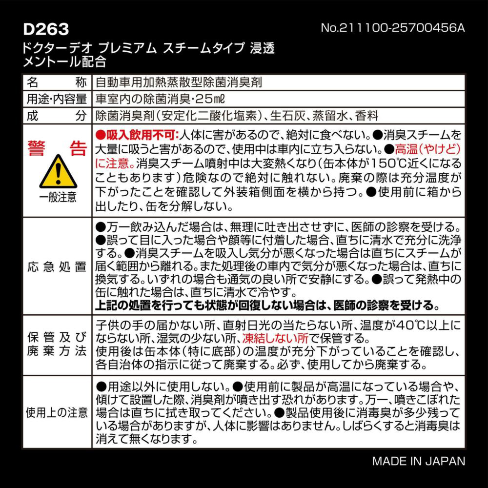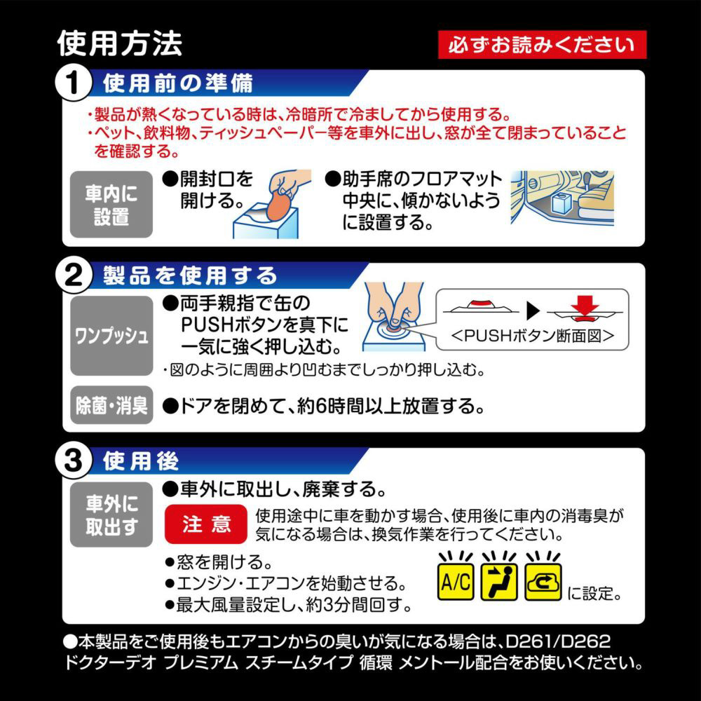 ※本製品をご使用後もエアコンからの臭いが気になる場合は、D261/D262 ドクターデオ プレミアム スチームタイプ 循環 メントール配合 をお使いください。
