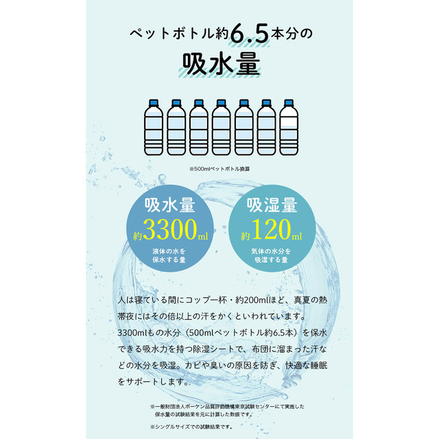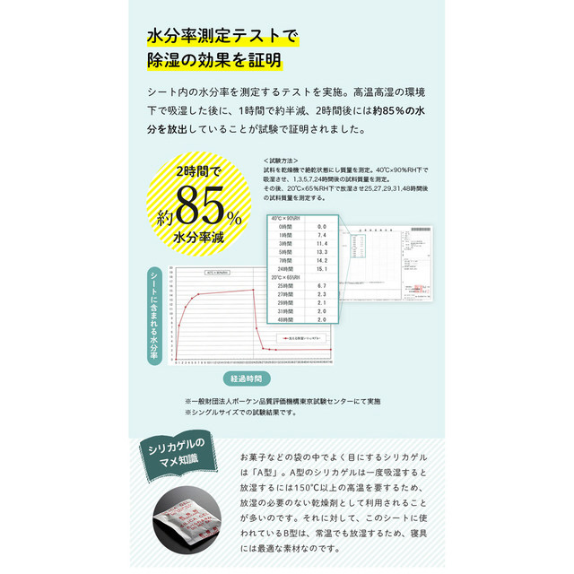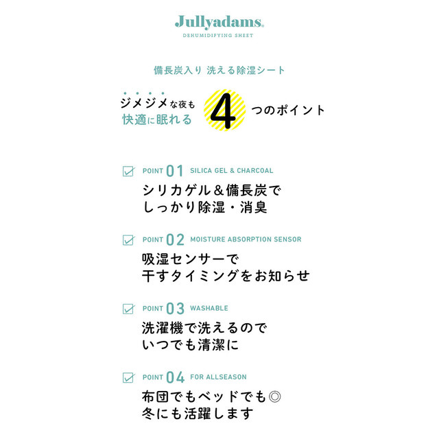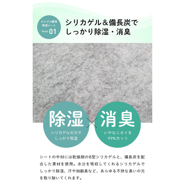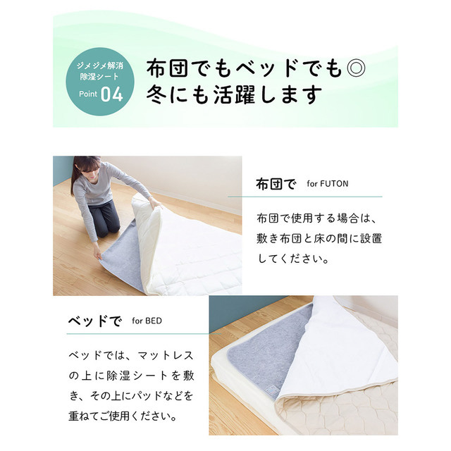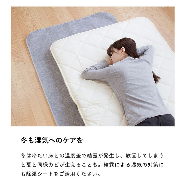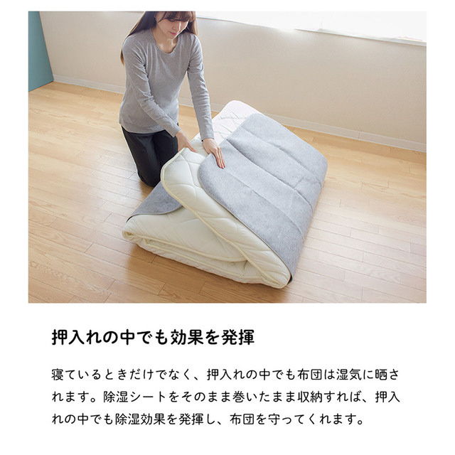 寝具を快適に使うための除湿シートです。カビの発生も防ぎます。消臭効果で気になる臭いも安心。ふとんを干せない時にもお手軽に除湿できます。
