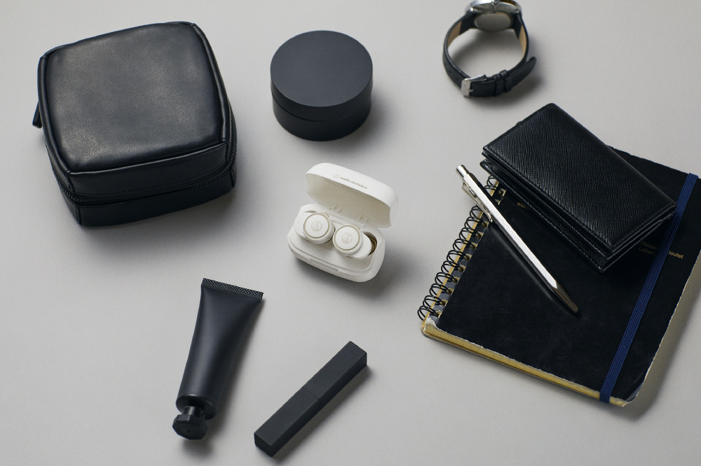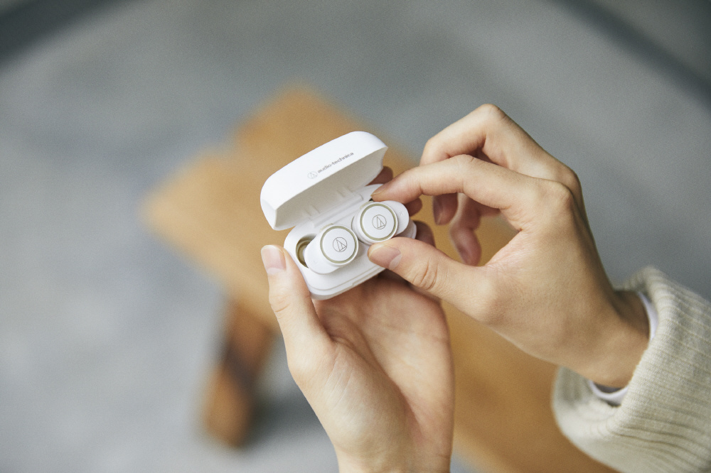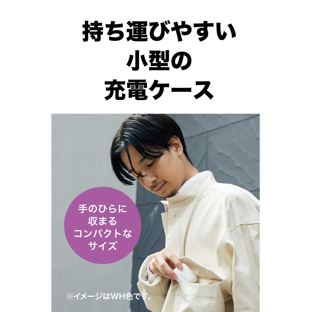 手なじみが良く落としにくいデザイン、耳に自然にフィットして疲れにくい装着感、イヤホンが取り出しやすく、どこでも持ち運びやすい小型の充電ケース。