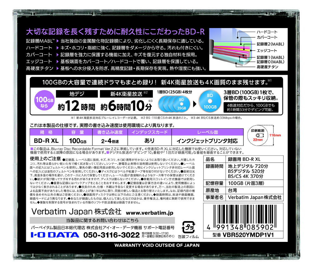 | 商品名 | 録画用BD-R XL 【生涯保存用ディスク「M-DISC」】 VBR520YMDP1V1 [1枚 /100GB /インクジェットプリンター対応] |