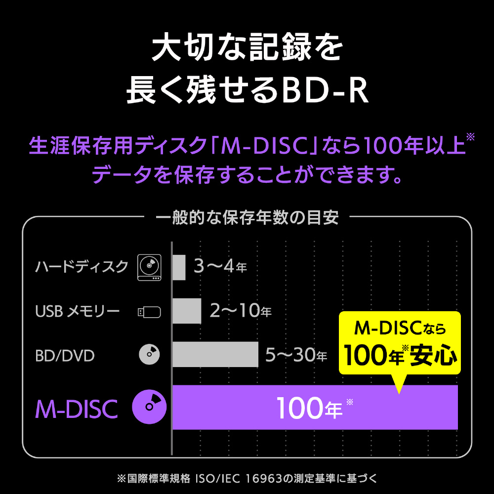 一般的なブルーレイディスクよりも、光・熱・湿度などによる経年劣化に強く、生涯保存・100年以上※データを保存することができる耐久性を高めた高信頼性ディスクです。