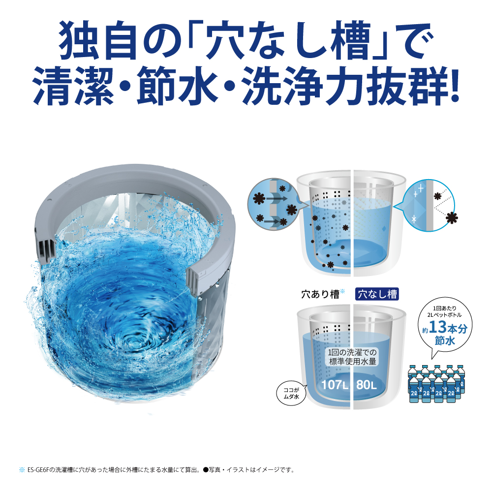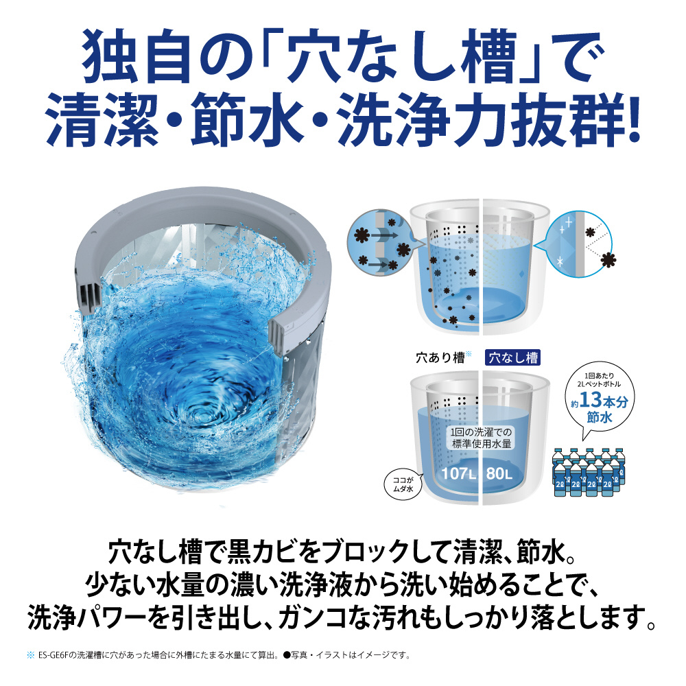 穴なし槽には節水効果もあります。お洗濯1回あたりで2Lペットボトル約13本分節水できます。