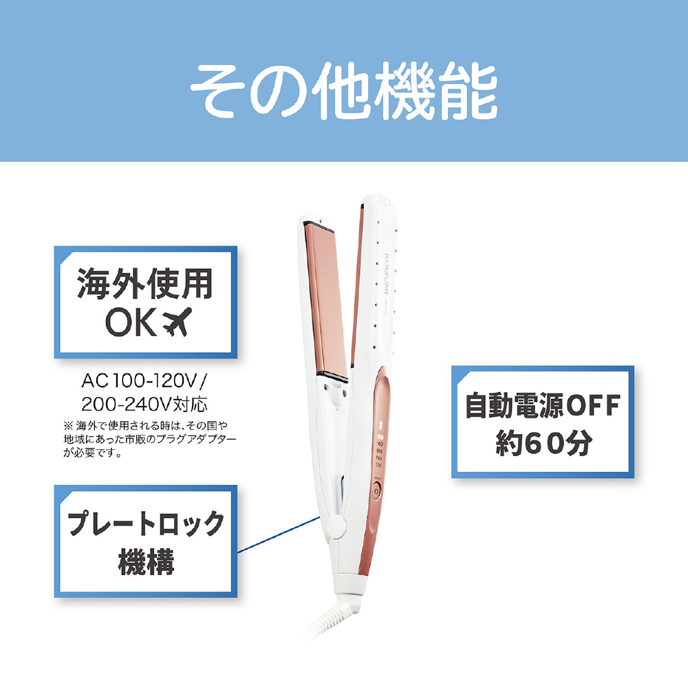 スピード加熱25秒(200℃設定、100度到達時)200℃の高温タイプ。5段階の温度調節(20℃刻み)。プレートロック&自動電源OFF約60分。WET&DRY機能。余分な水分を穴から蒸発させるため、濡れた髪でも使用可能。