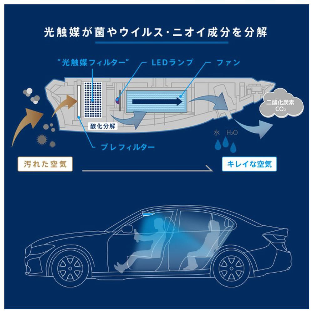 カルテック独自の光触媒技術で空気中の悪臭成分や有害物質、ウイルスなどを分解し、車内を常にキレイな空気へと浄化します。光触媒フィルターに光を照射すると、強力な酸化力を帯びるようになります。この光触媒が持つ強い酸化能力を利用して、空気中の悪臭成分や有害物質などを分解することができます。