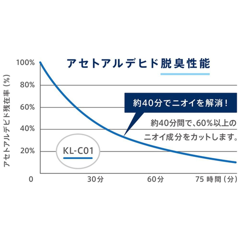 | 清浄時間の目安 | 約40分間で60%以上のニオイ成分をカット(アセトアルデヒド脱臭性能。<自社試験空間> 評価空間:200リットルBOX/想定:ガステック製検知管200L/初期濃度:5ppm) |