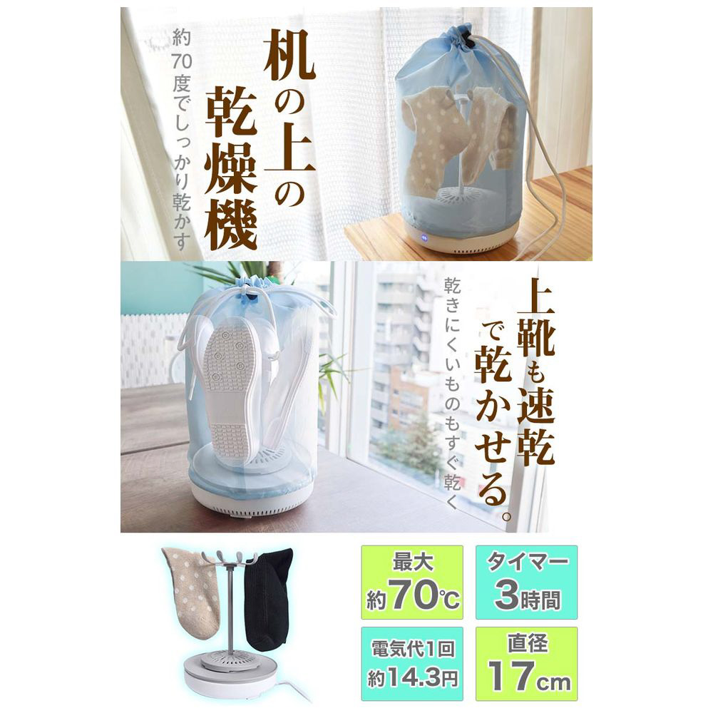 そこで靴下やハンカチ、タオルなどの小物を乾かすための超小型乾燥機を使ってみませんか。机の上に置いて使える直径17cmのコンパクト乾燥機。電気代も1回約15円で気軽に乾かすことができます。邪魔にならない小さな乾燥機ですが、パワフルにしっかり乾燥してくれます。