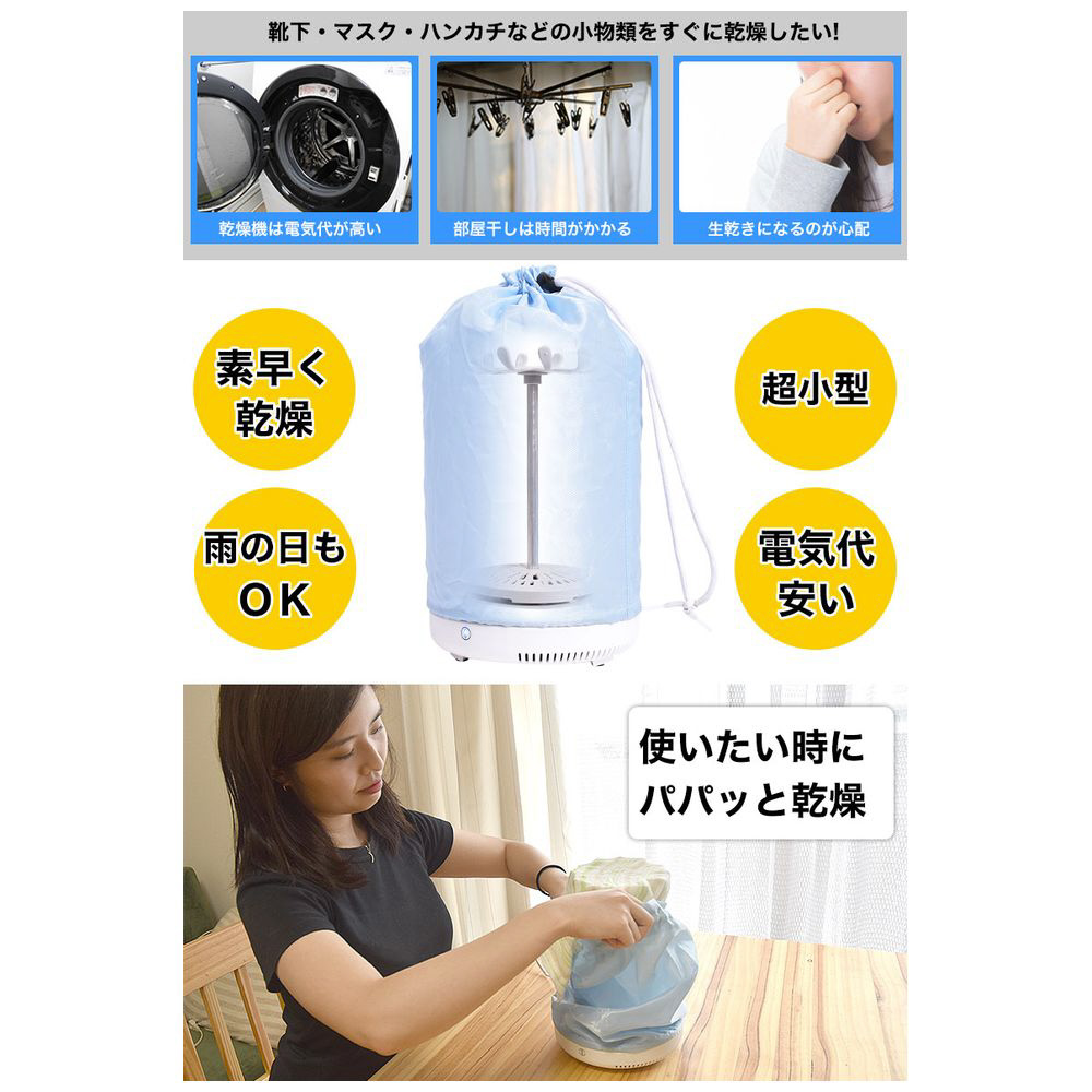 濡れたふきんをしっかり乾燥させたい。子供の靴や靴下を早く乾かしたい。でも乾燥機を使うと電気代がもったいない。ちょっとした小物を乾かすならば、 靴下や手袋、下着やハンカチ類などの小物専用、卓上でも使える超小型サイズの乾燥機がおすすめです。電気代は一般的な衣類乾燥機の10分の1以下。手に乗るサイズで収納場所にも困りません。タイマー付きだから電源を入れるだけ。使い方もとっても簡単、洗えるマスクも乾かせる卓上乾燥機です。