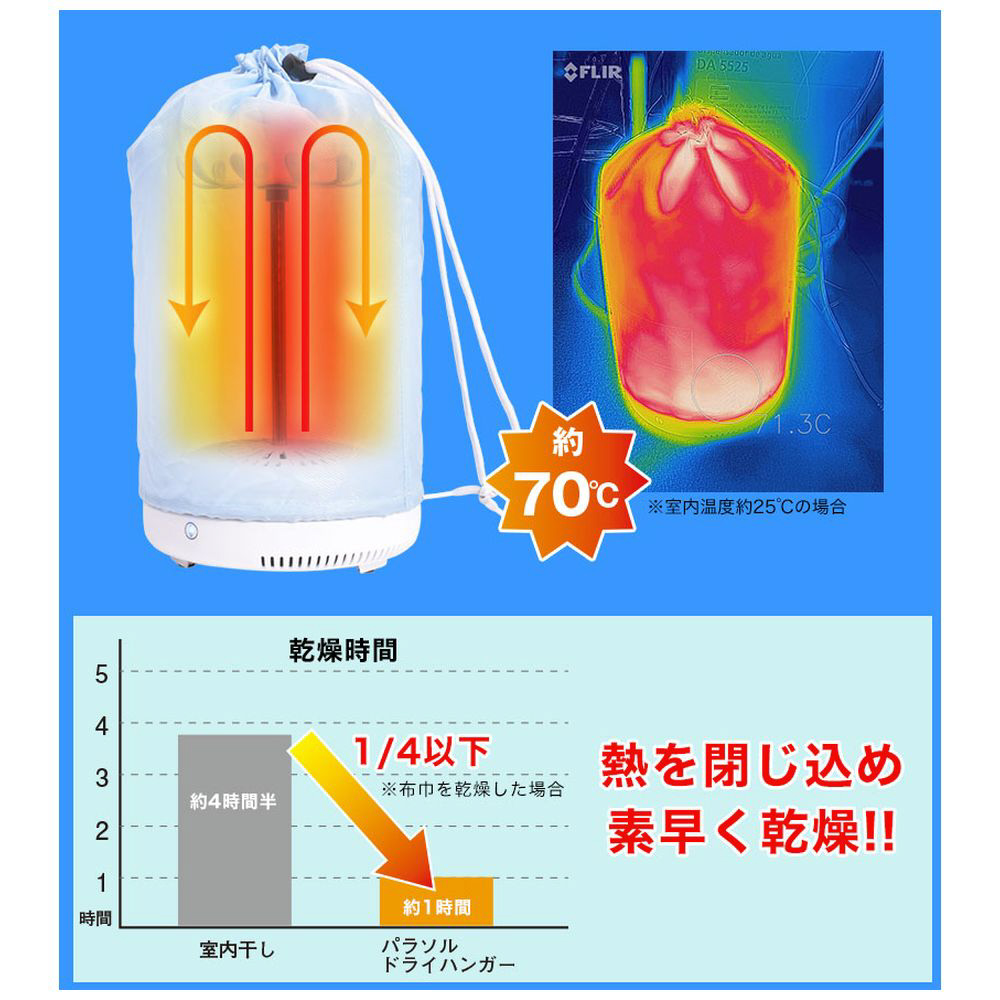 熱気を逃がさないようにフードが付属しています。内部を熱がもれなく循環し、しっかり乾かしてくれます。洗濯後室内干しした場合に比べて、4分の1以下の時間で乾燥することができます。