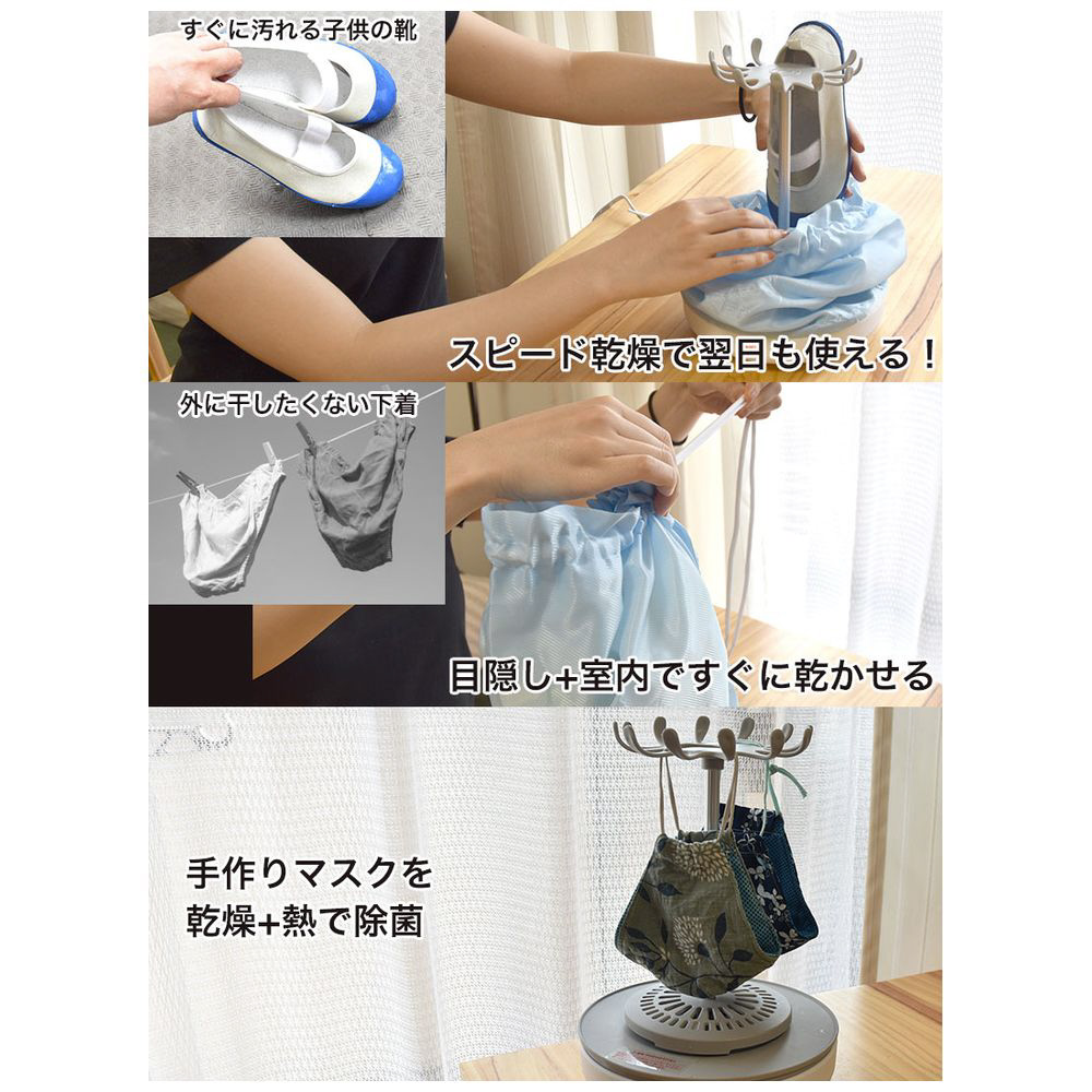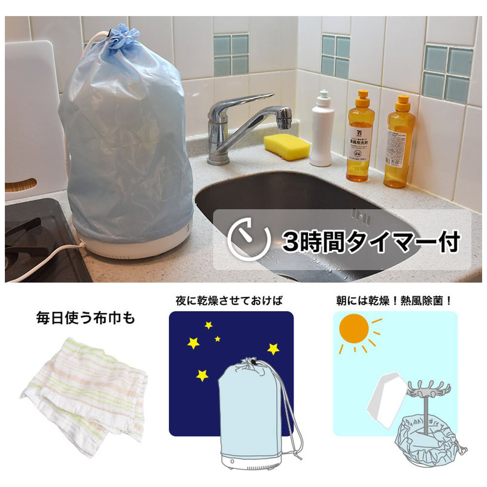 おすすめの使い方として、毎日使うふきんを夜この乾燥機にセット。タイマーで自動的に3時間後にはオフになっているので無駄に電気を使用することもなく、 翌朝にはしっかり乾燥されてますので、衛生的にふきんを使うことができます。その他常に清潔にしたい洗えるマスク、子供用の靴や靴下、人に見られたくない女性用の下着など 生活にかかわる様々な物を手軽に乾燥することができます。