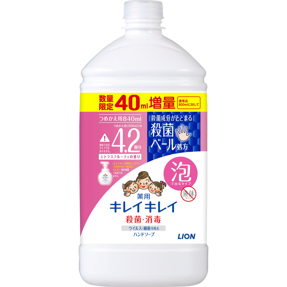 | 商品名 | キレイキレイ 薬用泡ハンドソープ(つめかえ用)特大サイズ (シトラスフルーティ) 増量品840mL |