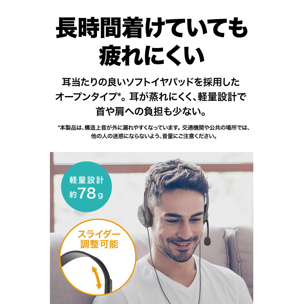 耳が蒸れにくく、ずっと着けていても快適さをキープ。軽量設計で首や肩への負担も少なく、長めの会議でも安心です。