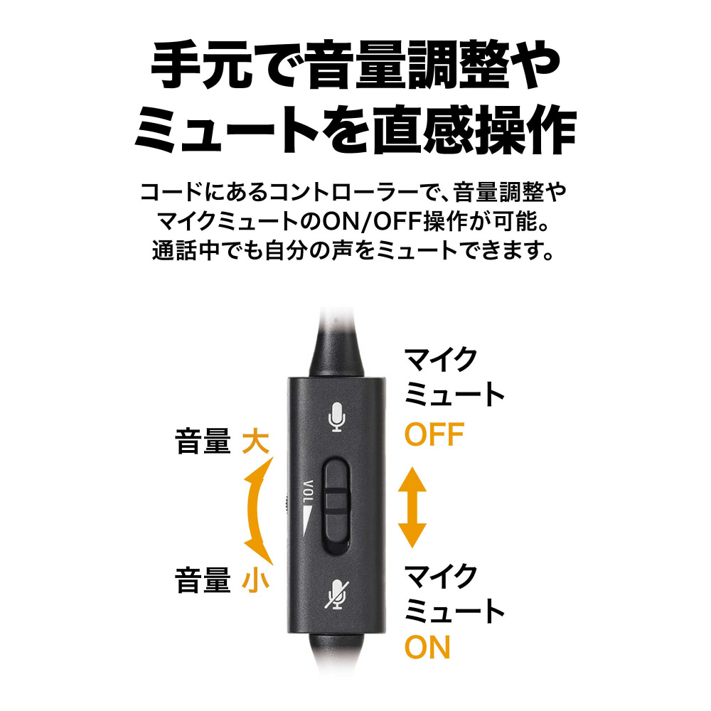 コードにあるコントローラーで、音量調整やマイクミュートのON/OFF操作が可能。通話中でもPC 画面から目を逸らさずに、自分の声を瞬時にミュートできます。