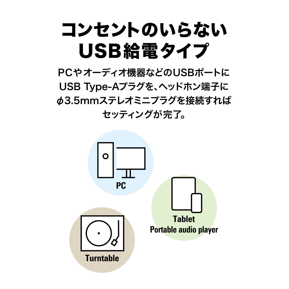 PCやオーディオ機器などのUSBポートにUSB Type-Aプラグを、ヘッドホン端子にφ3.5mmステレオミニプラグを接続すればセッティングが完了。音楽を聴きたいときに、すぐに使えるので便利です。また、有線接続のため、音が遅れて聴こえるような心配もありません。