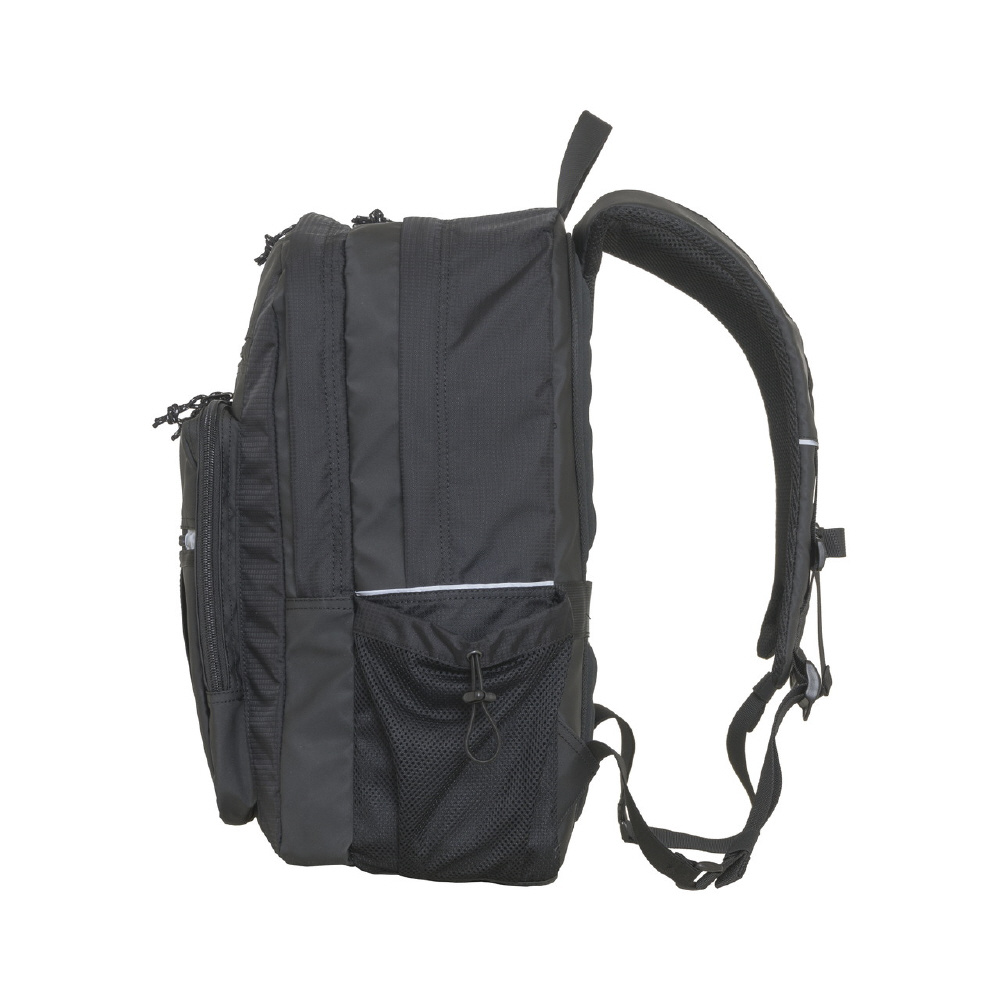 肩のずれ落ちを防ぐチェストベルトと夜間に反射するリフレクター付きです。