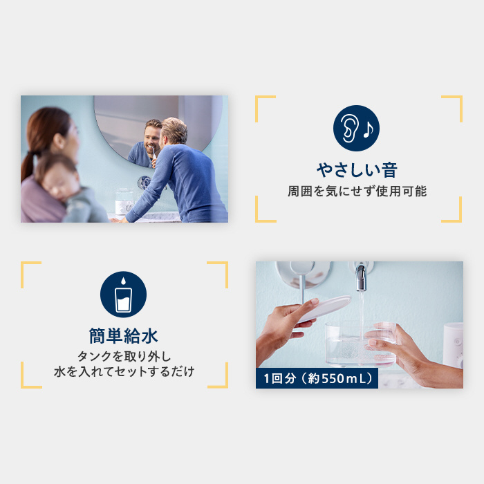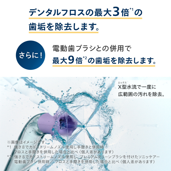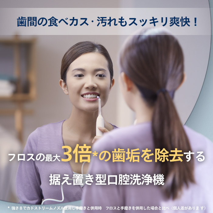 X型水流で歯間の食べカス・汚れもスッキリ爽快!フロスの最大3倍の歯垢を除去する 据え置きモデル。