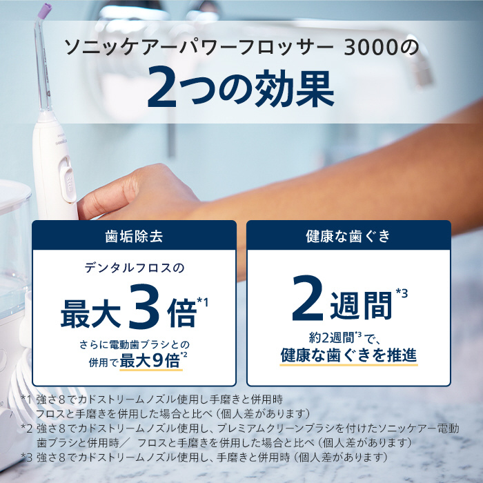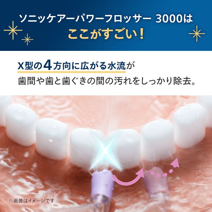 X型の4方向に広がる水流が歯間や歯と歯ぐきの間の汚れを除去。矯正器具をご使用の方でもお使いいただけ、磨きにくい部分や矯正器具の歯垢や汚れも除去。ソニッケアーパワーフロッサー 3000はデンタルフロスの最大3倍を除去し、ソニッケアーの電動歯ブラシと併用で、最大9倍の歯間の歯垢を除去します。