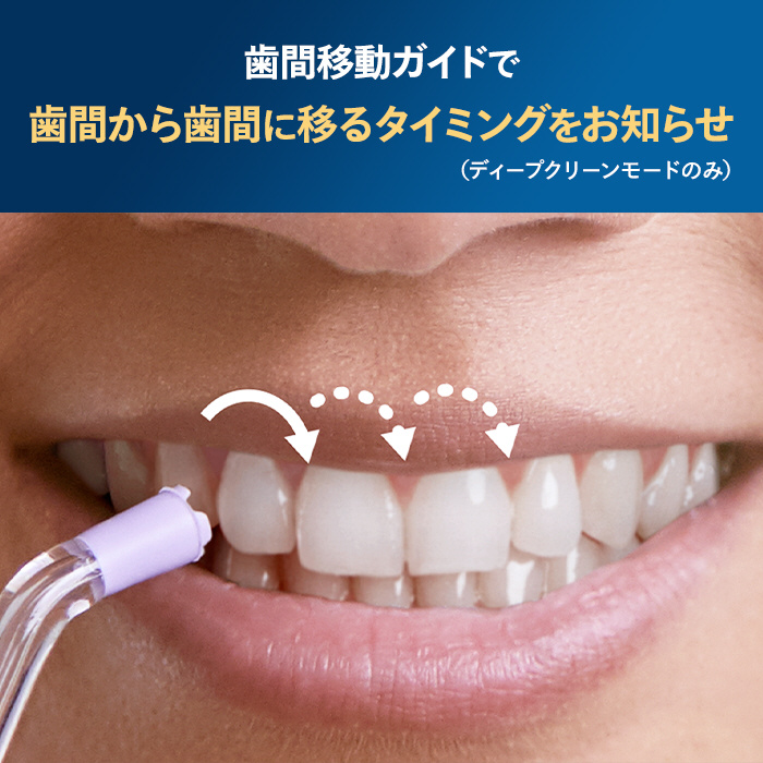 一定間隔で水圧の強弱が変化し、短い一時停止時間が挟まれるため、次の歯間に移るタイミングがわかりやすく、歯間全体をきれいにします。