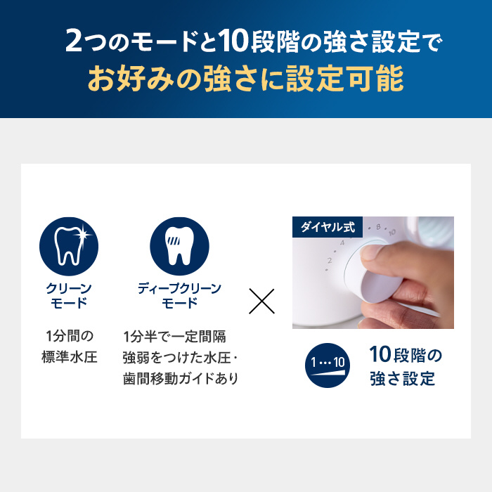 1分間標準水圧がかかるクリーンモードと、1分半で一定間隔の強弱をつけた水圧がかかり、歯間移動ガイドがあるディープクリーンモードの2つからモードを選べます。また、強さはダイヤル式で10段階から選べます。