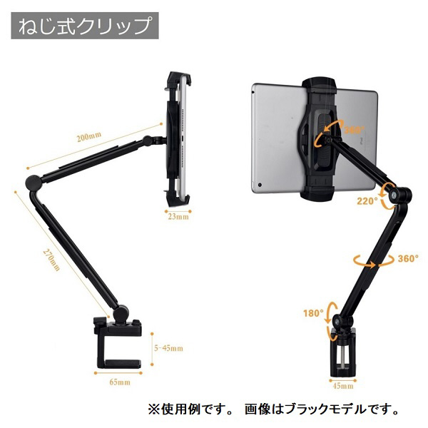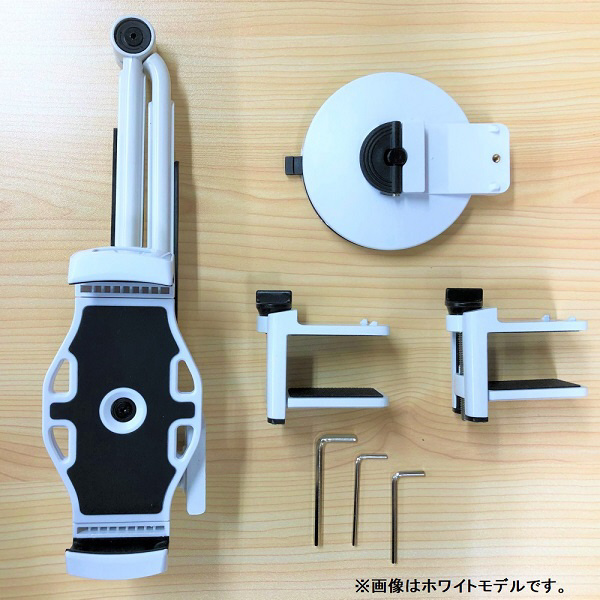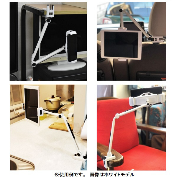 1本3役 デスク/キッチン/ベッドなどで大活躍! 簡単取り付け! アタッチメント付替可能! タブレット以外にもスマートフォンやゲーム機、小型モニターなど挟めるものであればお使いいただけます。