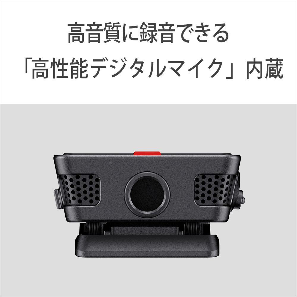音声をマイク内部でダイレクトにデジタル信号へ変換することで、音声信号に劣化がなく高音質に録音できる「高性能デジタルマイク」を搭載。マイク取付部には小型モデルながら自然なステレオ録音を実現するために、効率的に集音できるパラボラ形状を採用。またステレオ強調機能の搭載でより立体的で臨場感豊かな録音を可能にしました。内蔵メモリーには大容量16GBフラッシュメモリーを採用しているので、長時間の録音も安心です。