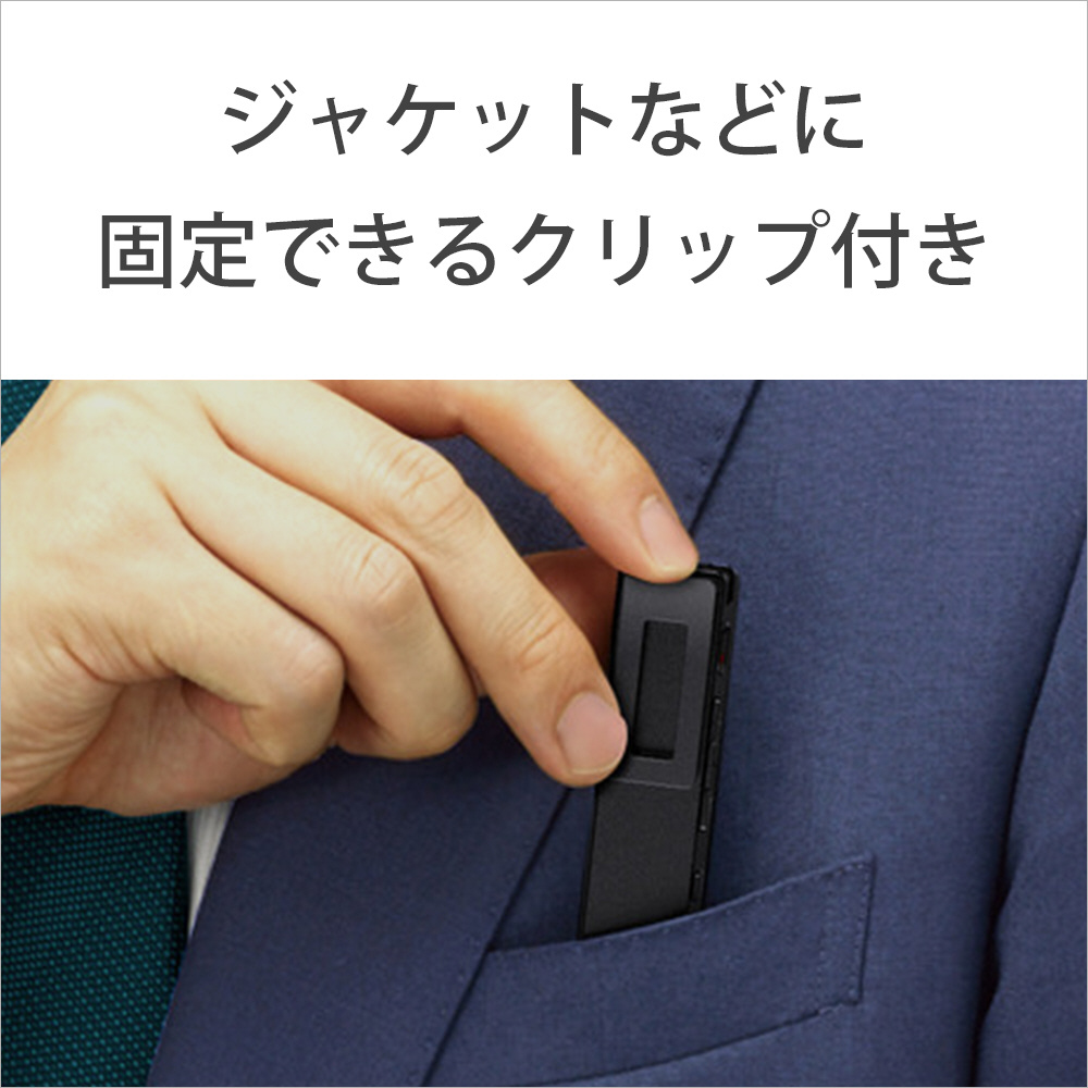 録音時に便利なクリップを本体背面に装備。ジャケットの胸ポケットやバッグ、手帳などに固定したままスマートに録音できます。