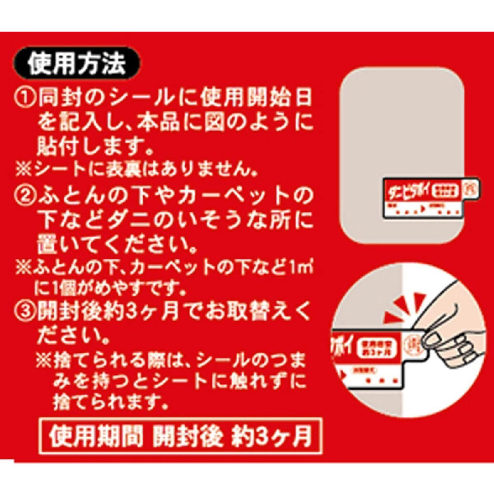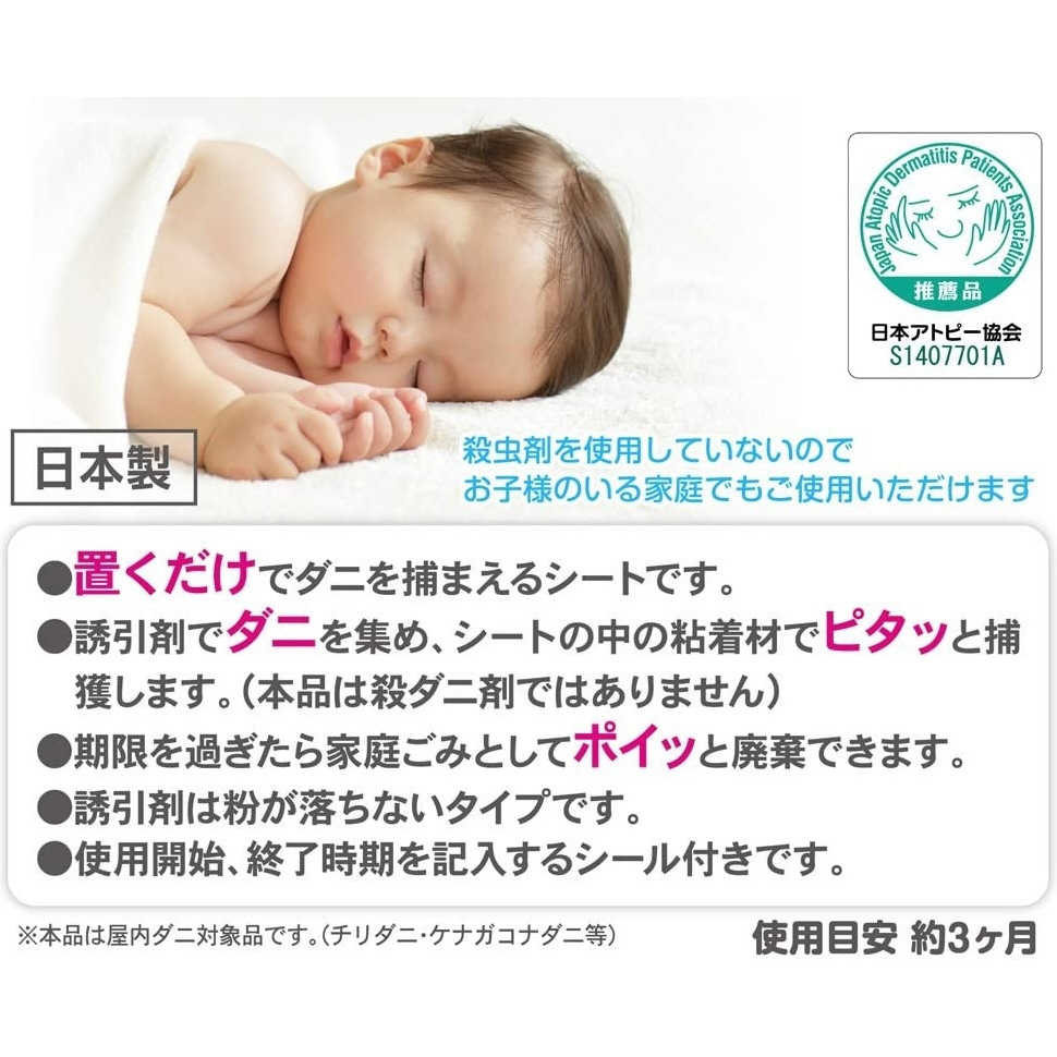 置くだけで簡単なダニを誘引・吸着します。同封のシールに使用開始日を記入し、本品の図のように貼付します。シートに表裏はありません。ふとんの下やカーペットの下などダニのいそうな所に置いてください。ふとんの下、カーペットの下など1平方メートルに1個がめやすです。開封後約3ヶ月でお取替えください。捨てる際は、シールのつまみを持つとシートに触れずに捨てられます。