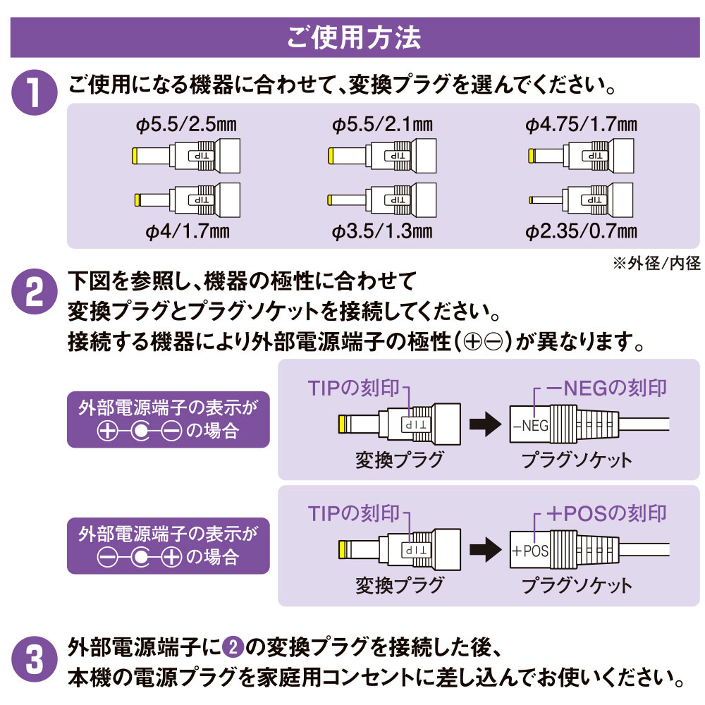 ■ 付属品:変換プラグ(外径/内径)…φ5.5/2.5mm、φ5.5/2.1mm、φ4.75/1.7mm、φ4/1.7mm、φ3.5/1.3mm、φ2.35/0.7mm