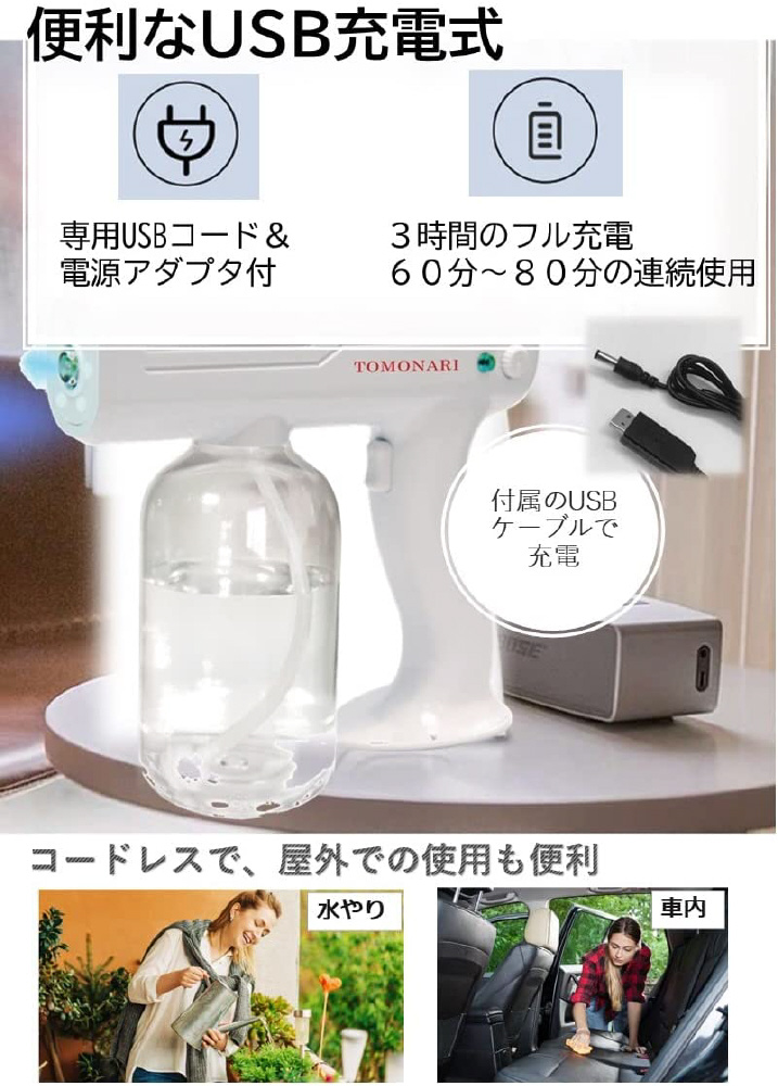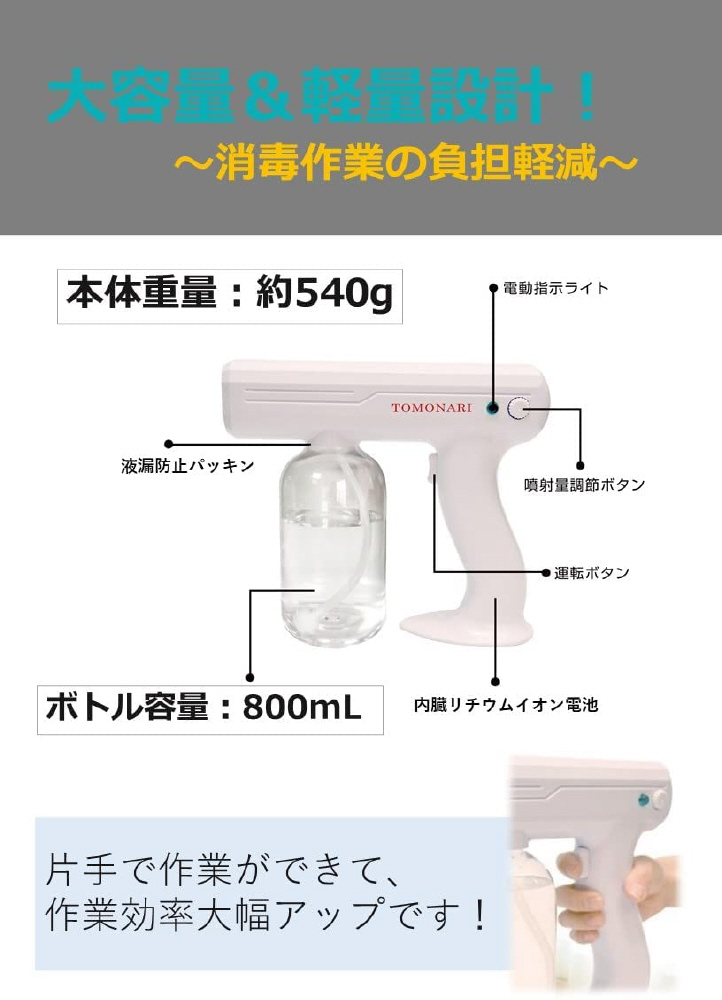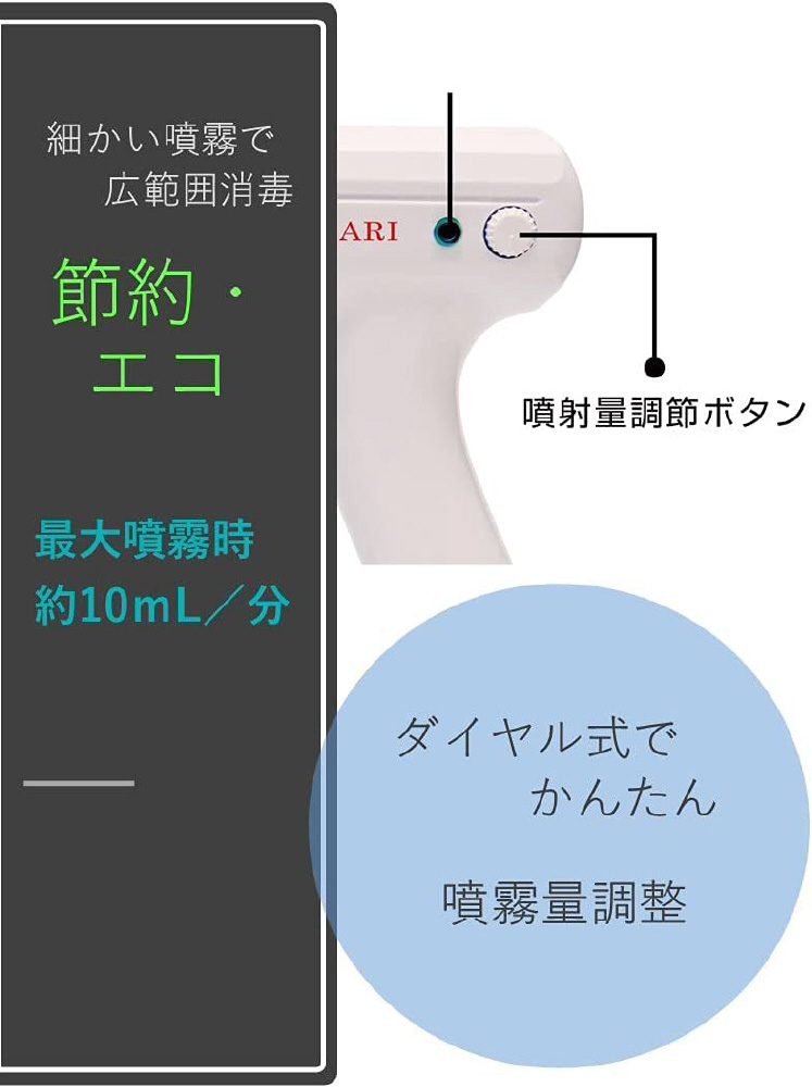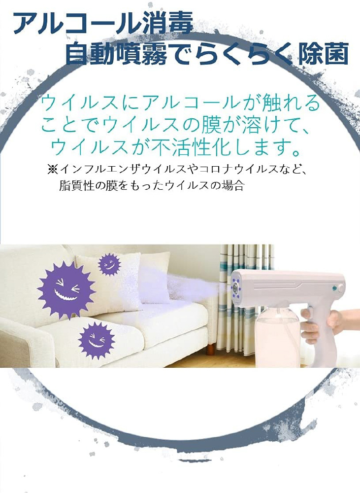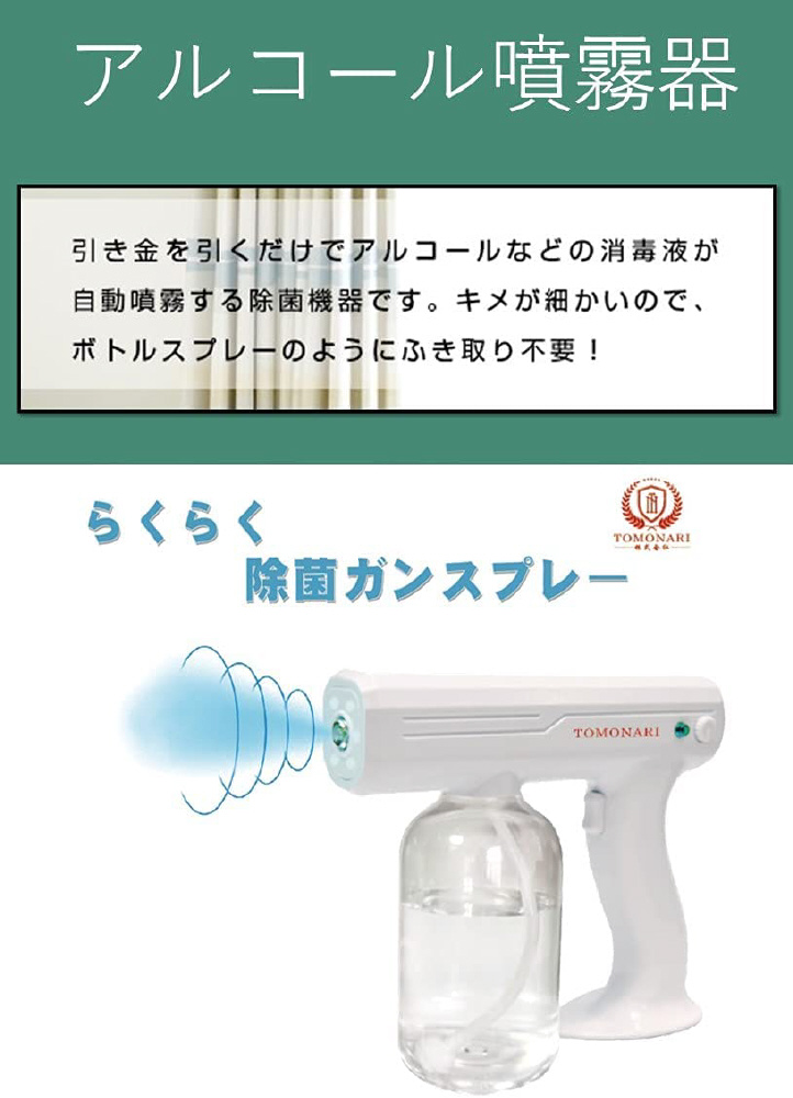 引き金を引くだけでアルコールなどの消毒液が自動噴霧する除菌機器です。