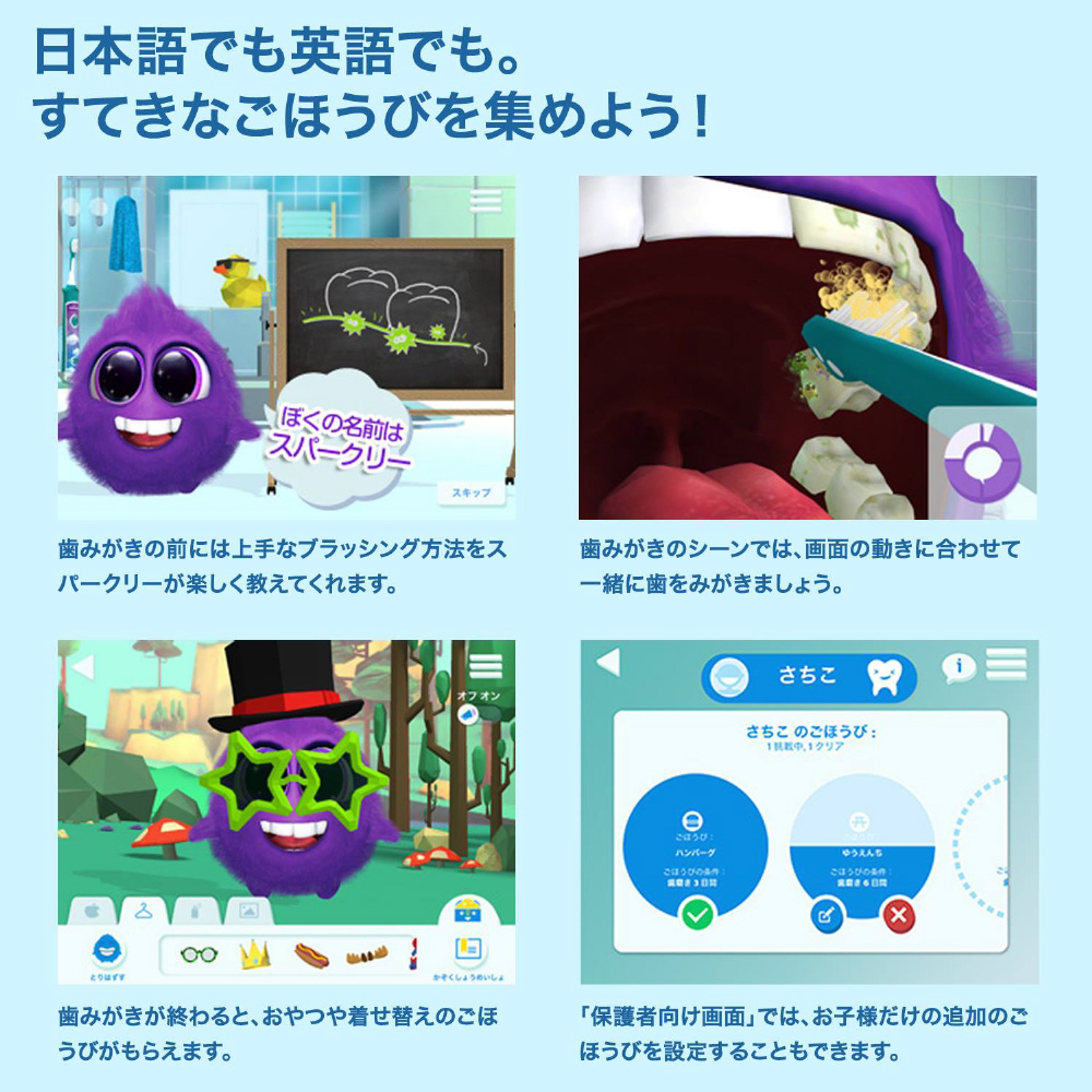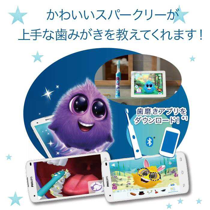 ■アプリでは、ソニッケアーのオリジナルキャラクター「スパークリー」の歯のお手入れを通じて、子どもに上手な歯磨きの技術と習慣を楽しく身につけてもらうことができます。