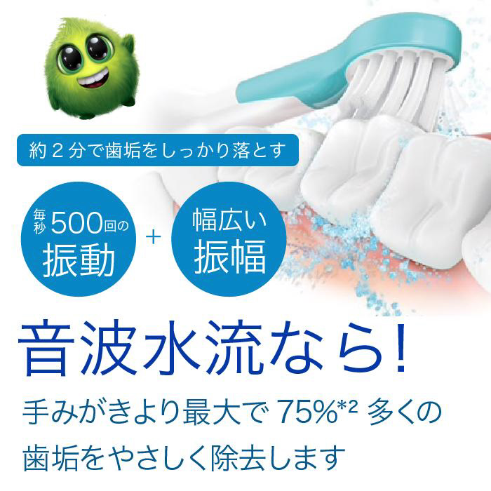 ■毎秒500回の振動と幅広い振幅の組み合わせで音波水流を発生させて、お口の汚れをやさしくしっかり落とします。