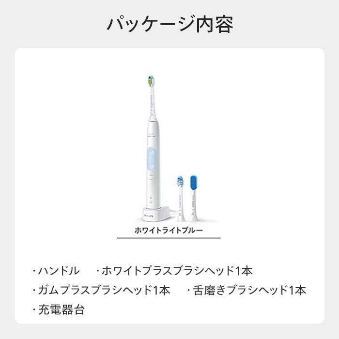 付属品 | ハンドル:プロテクトクリーン 1本 ブラシヘッド:舌磨きブラシヘッド 1本、ホワイトプラス 1本、ガムプラス 1本 充電器 |