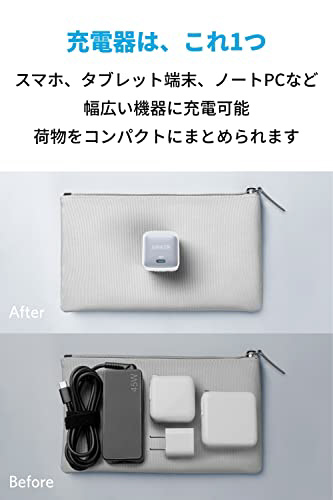 スマホにもノートPCにも使える持ち運びに便利な超コンパクト急速充電器。一般的な45W出力の充電器に比べ約35%小さなコンパクトサイズを実現。折りたたみ式プラグを採用し、どこにでも気軽に持ち運ぶことができます。