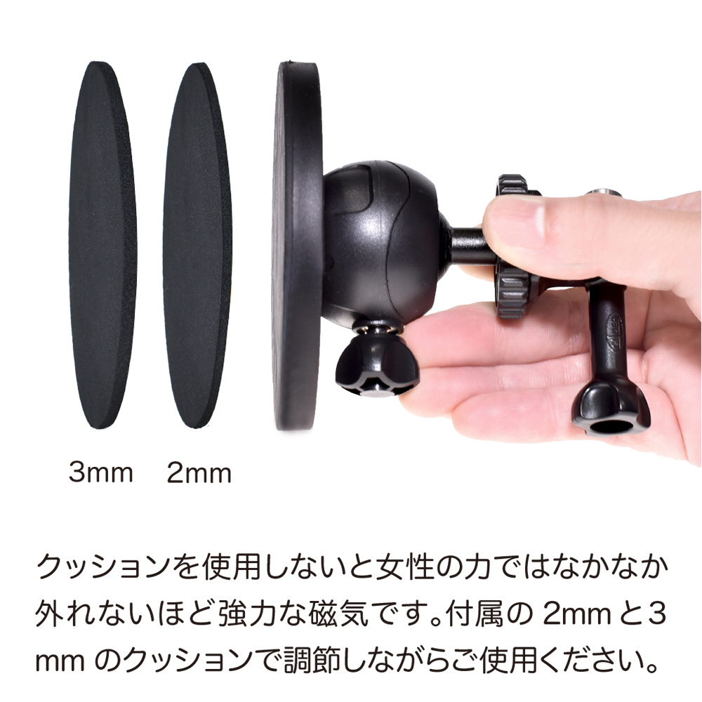 2種類調整用クッション同梱、強力なマグネットマウントです。ベース部分はラバーコーティングで滑りにくく、吸着部を傷つけることなく、固定力も抜群です。