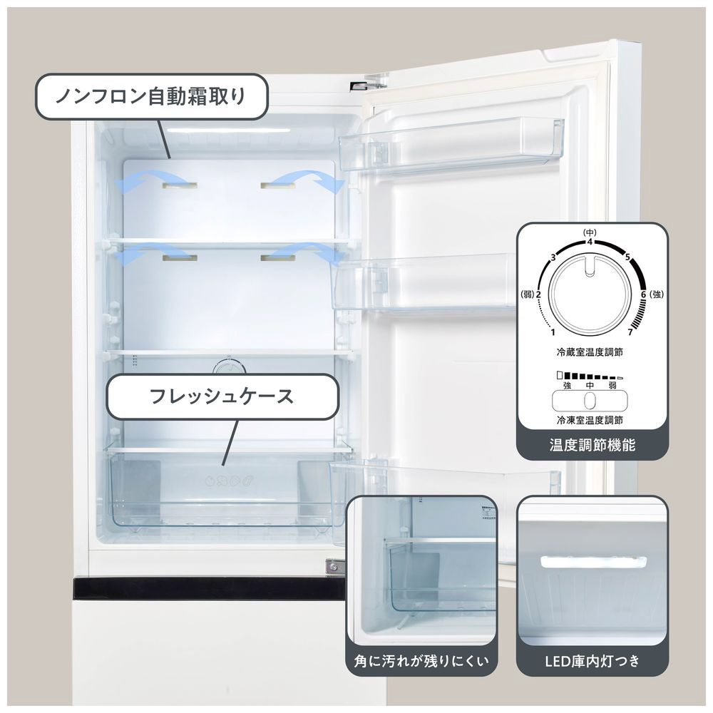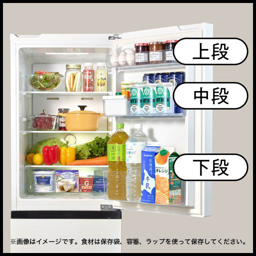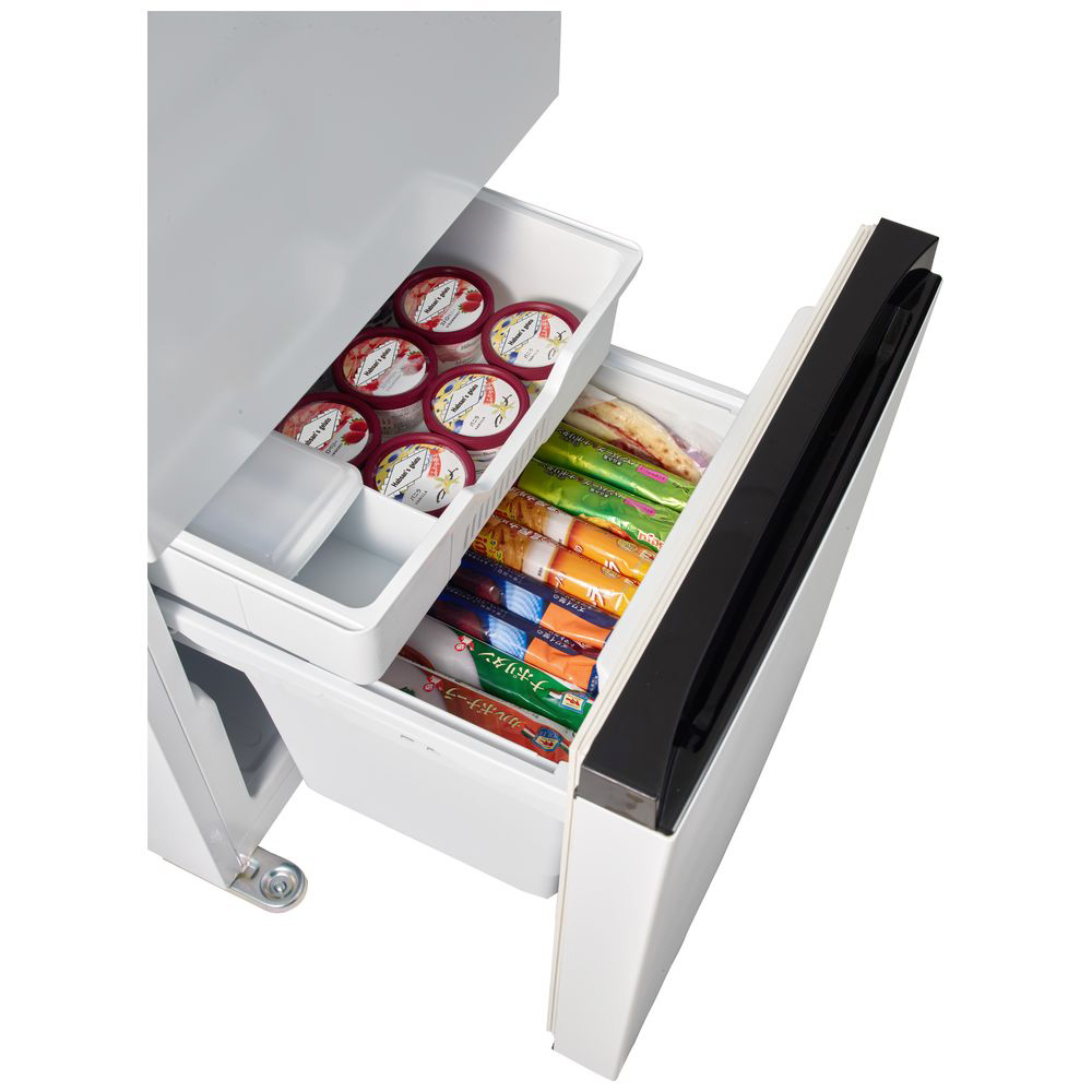 機能性・使いやすさを重視したファン式冷凍冷蔵庫。たっぷりサイズ2段式冷凍室。アイスクリームや冷凍食品などをサイズに合わせて見やすく整理できる2段式収納。