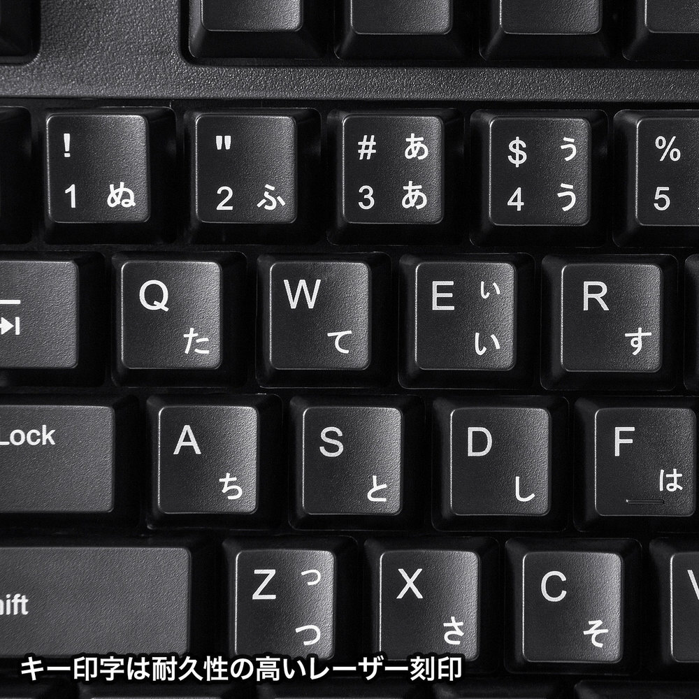 文字の耐久性に優れたレーザー刻印を採用したスタンダードUSBキーボード。ブラック。