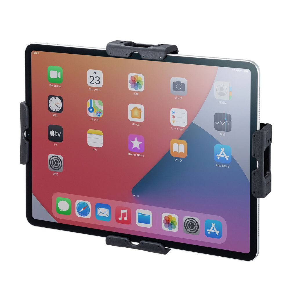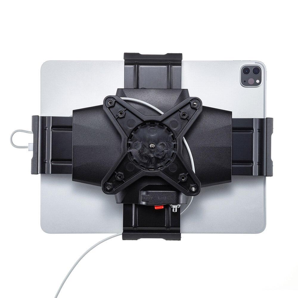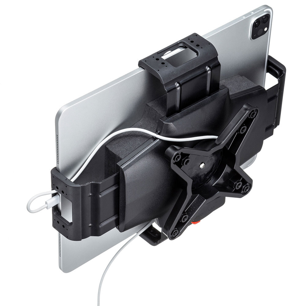 ケースに入れたまま設置できるVESA75/100対応の盗難防止用鍵付きタブレットホルダー。