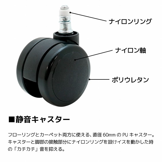 キャスターと脚部の接触部分にナイロンリングを設けイスを動かした時の「カチカチ」音を抑える。