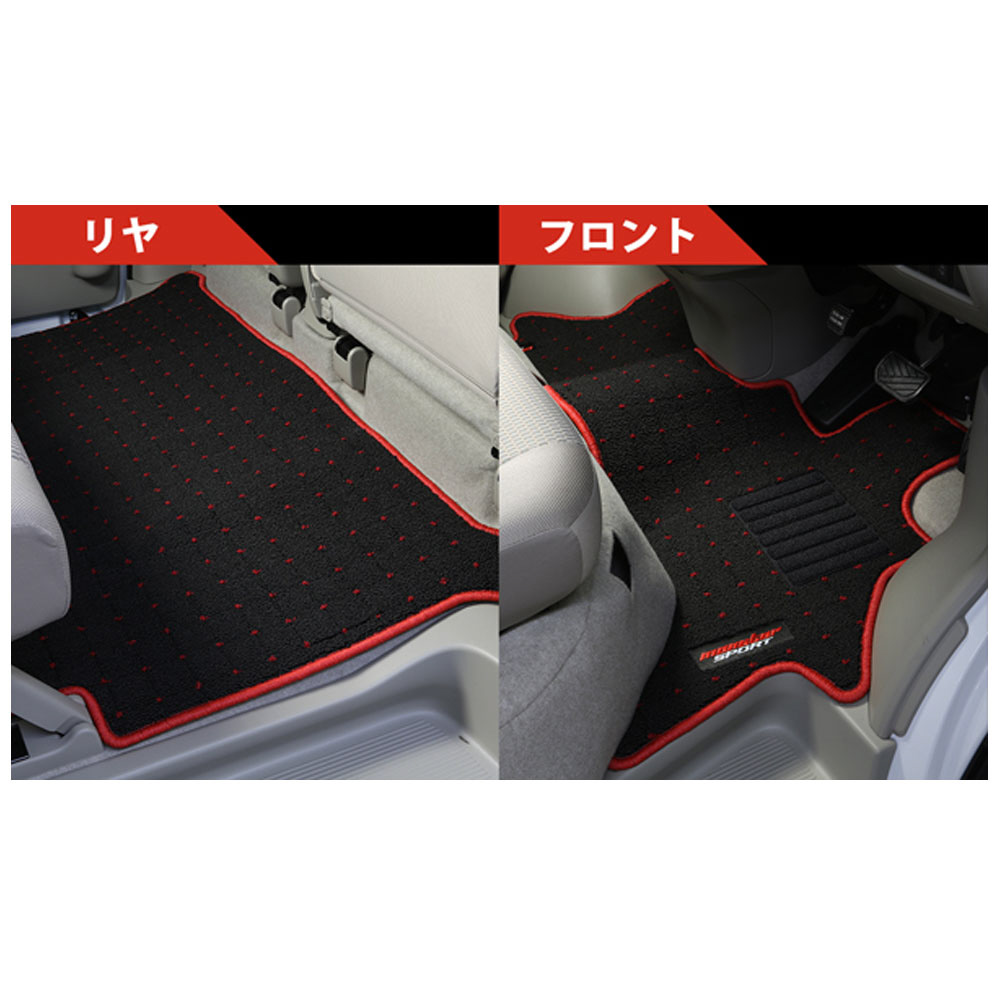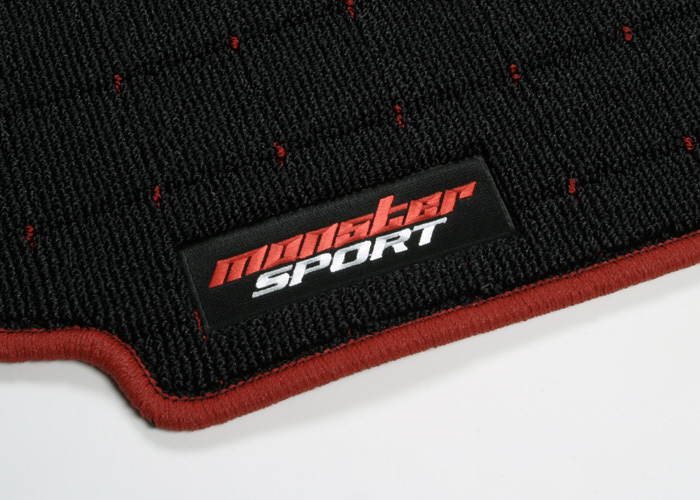 素材や目付量にこだわり、高級感ある生地に仕上げました。前席用には刺繍でモンスタースポーツのロゴをあしらい、ブラック×レッドのコントラストがインテリアに華やかさを与えます。耐久性に優れた素材とズレ防止構造、ヒールパッドの装備によってスポーツドライビングをしっかりとサポートします。