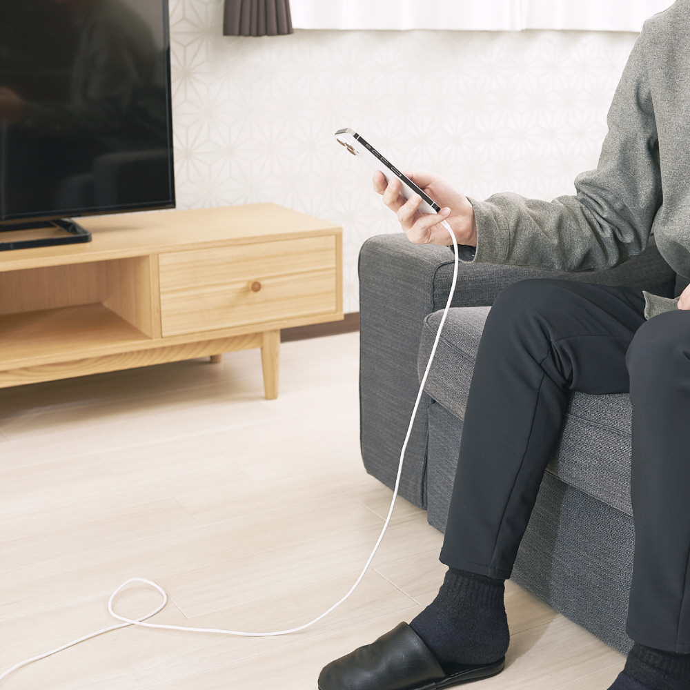 シリコン素材を採用した柔らかく、なめらかな手触りのLightningケーブルです。 折り癖のつきにくさと高い耐久性を兼ね備えているので、モバイル用として束ねて持ち運ぶのにおすすめです。 iPhoneの高速充電に対応。 Lightningコネクタを搭載したiPhoneなどとUSB Type-C(TM)ポートを搭載したパソコンや充電器を接続し、充電・データ転送ができます。