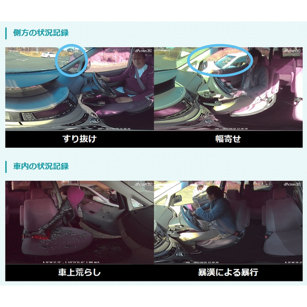 ■前後カメラでは撮影が難しい側方や車内アクシデントもしっかり捉える。
