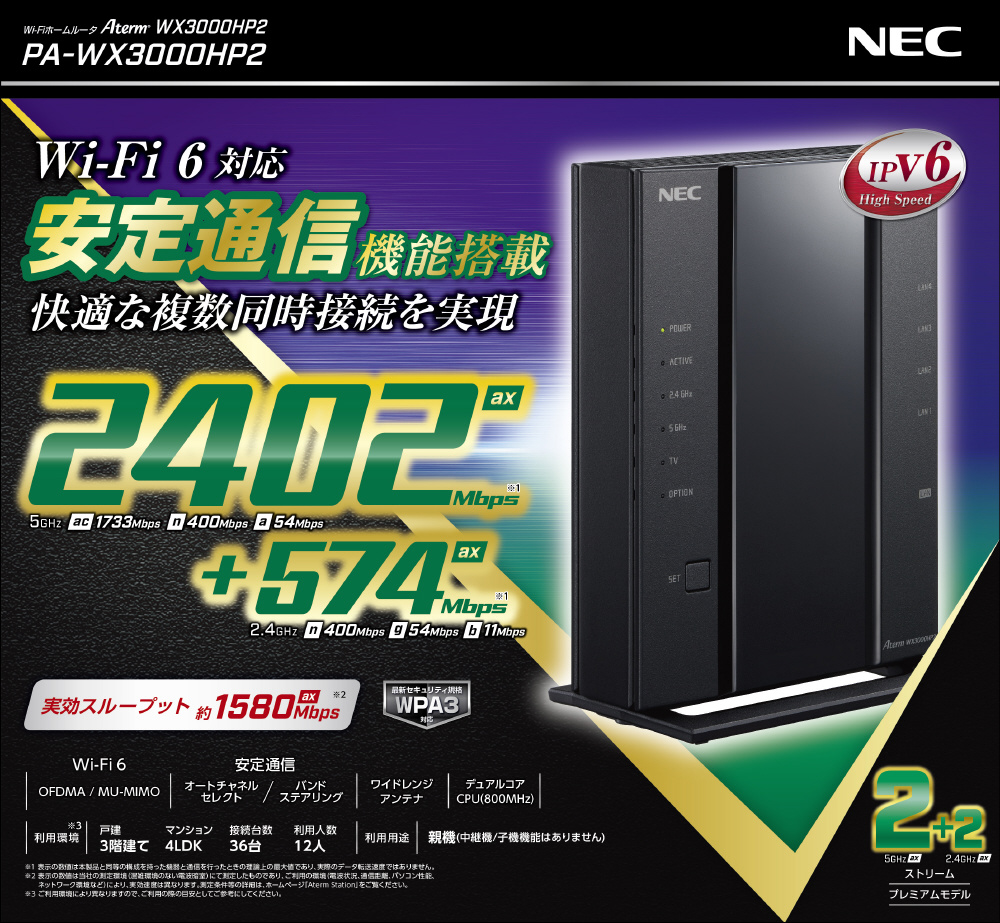Wi-Fiルーター Aterm(エーターム) PA-WX3000HP2 [Wi-Fi 6(ax) /IPv6対応]